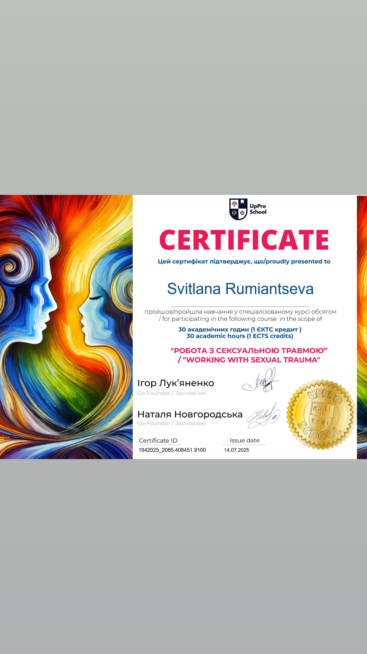 - Сертификат «Професійна мистецька освіта і художня культура: виклики ХХІ століття» с 2020 года