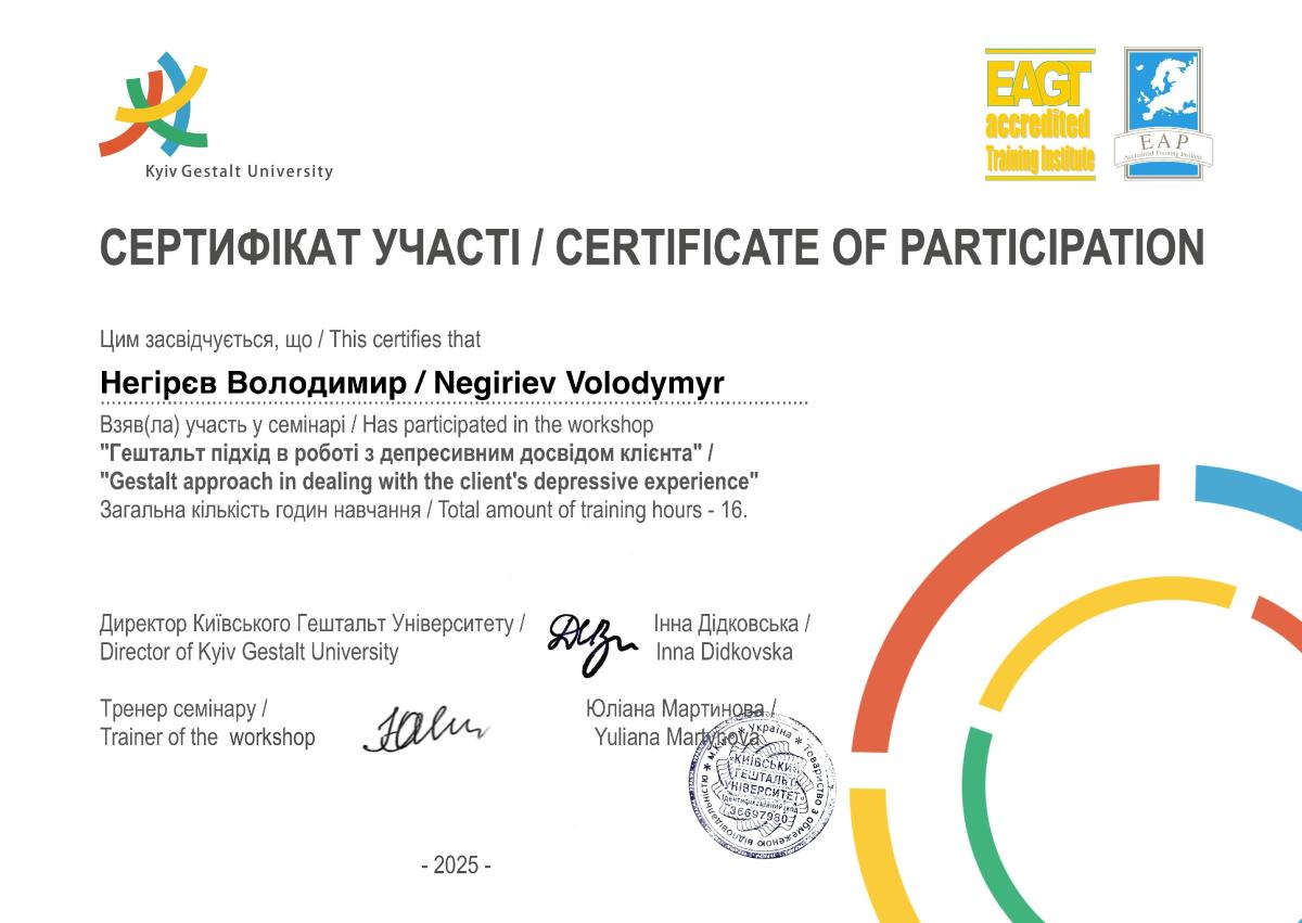 - Сертификат "Гештальт подход в работе с депрессивным опытом клиента" (Киевский Гештальт Университет) с 2025 года