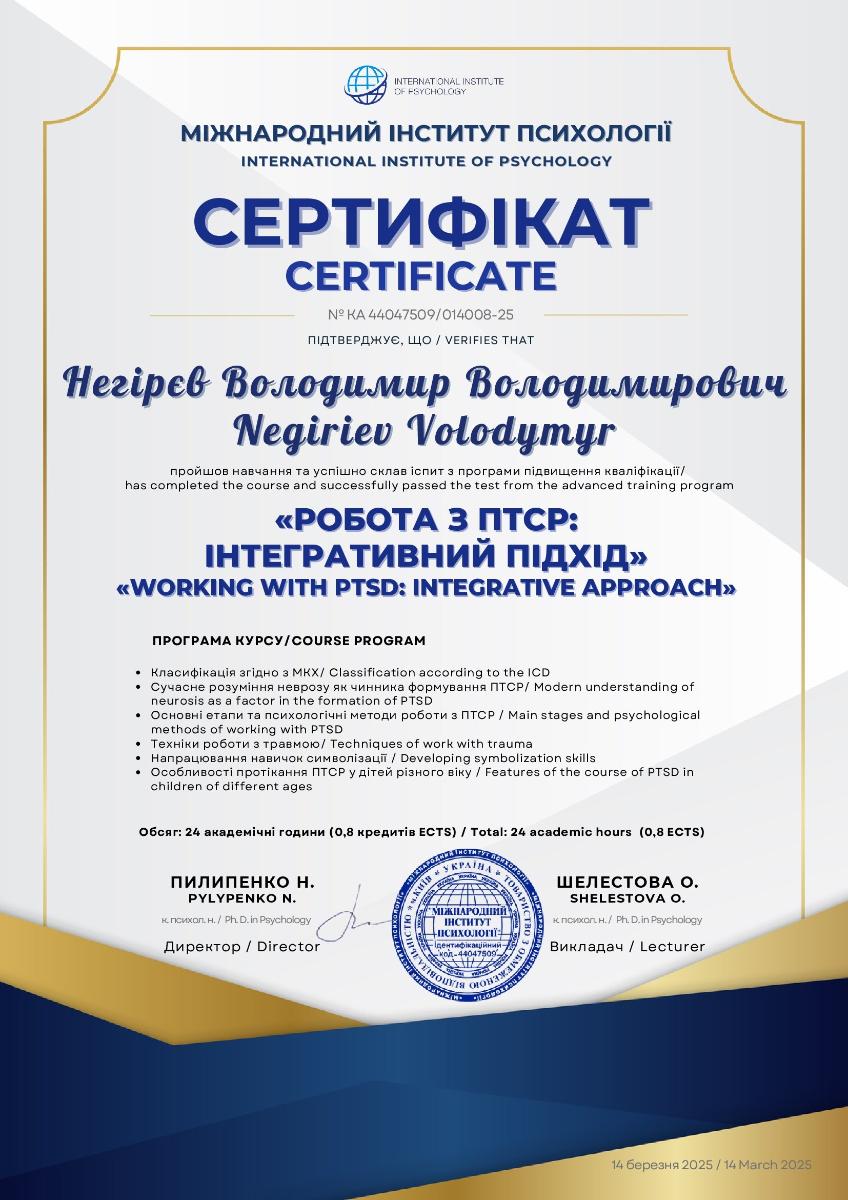 - Сертификат "Работа с ПТСР: интегративный подход" с 2025 года