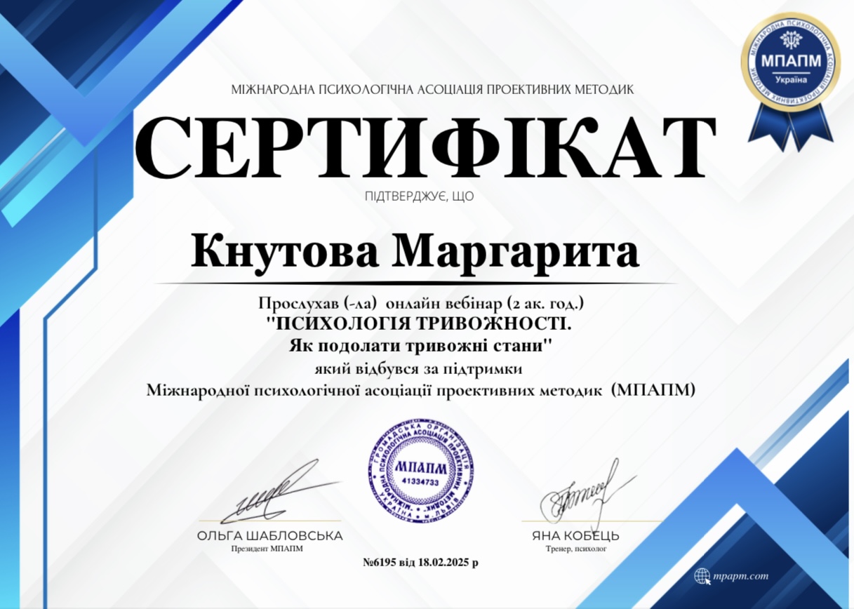 - Сертификат "Практична психологія", 72 години с 2024 года