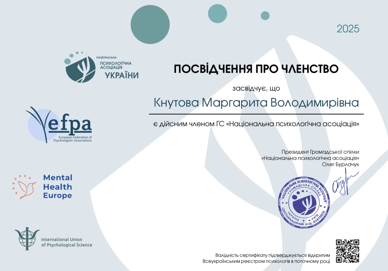 - Сертификат «Базова психологічна допомога в умовах війни" с 2023 года
