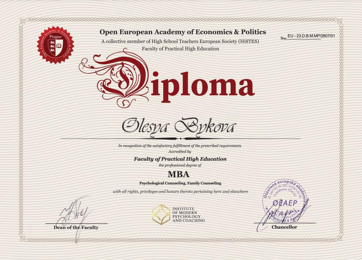 - Сертификат Open European Academy of Economics & Politics A collective member of High School Teachers European Society (HiSTES) Faculty of Practical High Education с 2024 года