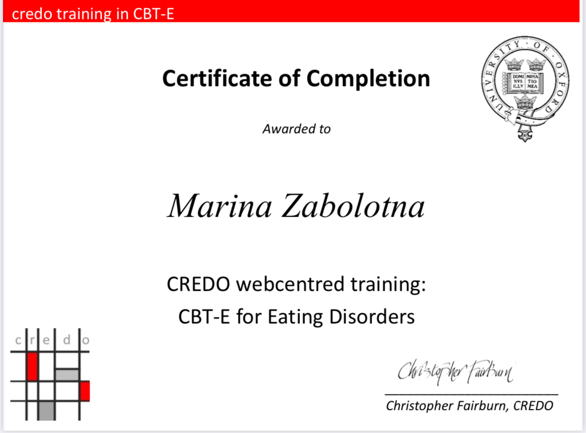 Сертифікат Виданий: Centre for research on eating disorders at Oxford " Посилена КПТ розладів харчової поведінки" Крістофер Фейрберн