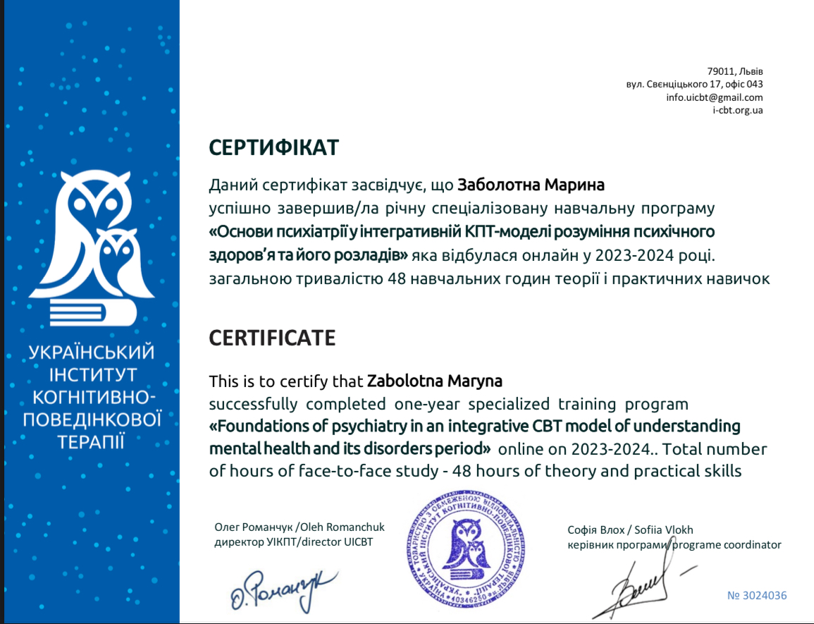 - Сертификат УИКПТ Основы психиатрии с 2024 года