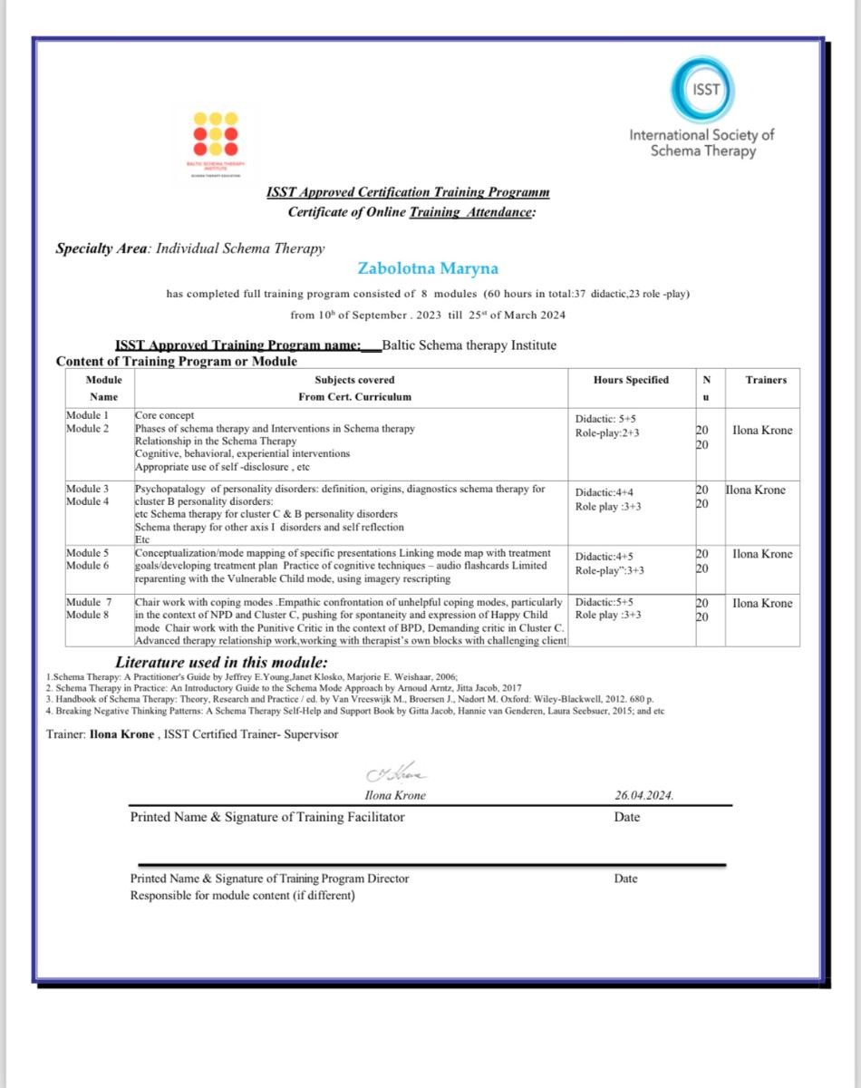 • консультую протягом 5 років у рамках приватної практики та в рамках проєкту ГД ООН в Україні " Mental Help"