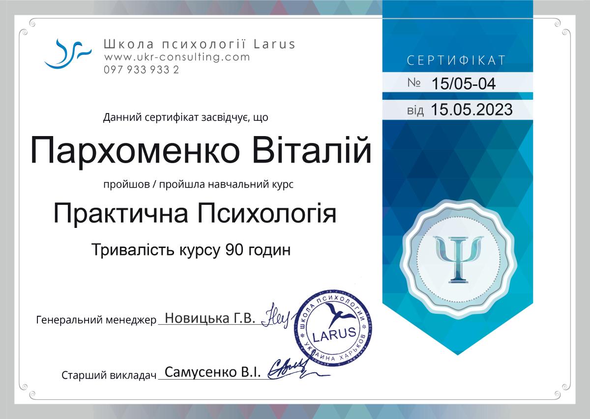 - Сертификат Сертификат о прохождении курса Практическая психология с 2023 года