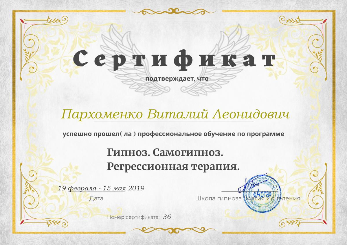 - Сертификат Сертификат о прохождения курса Гипнотерапия и Регрессивный гипноз с 2019 года