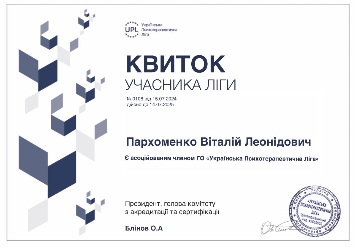 - Сертификат Сертификат Членство участника Украинской Психотерапевтической Лиги (УПЛ) с 2024 года с 2024 года