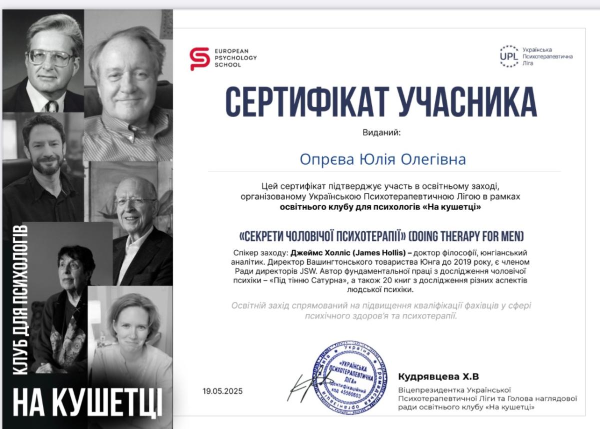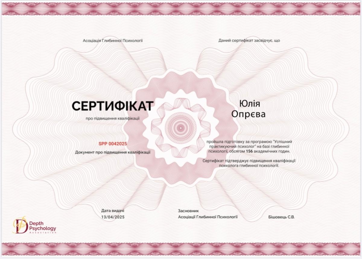 - Сертификат Успешный практикующий психолог в методе глубинной психологии с 2025 года