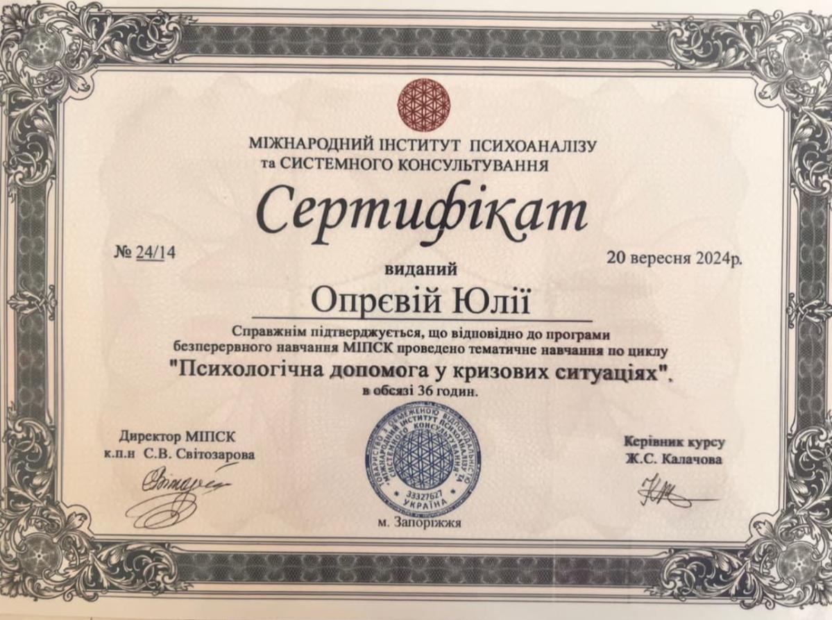 - Сертификат МИПСК «Психологическая помощь в кризисных ситуациях» с 2024 года