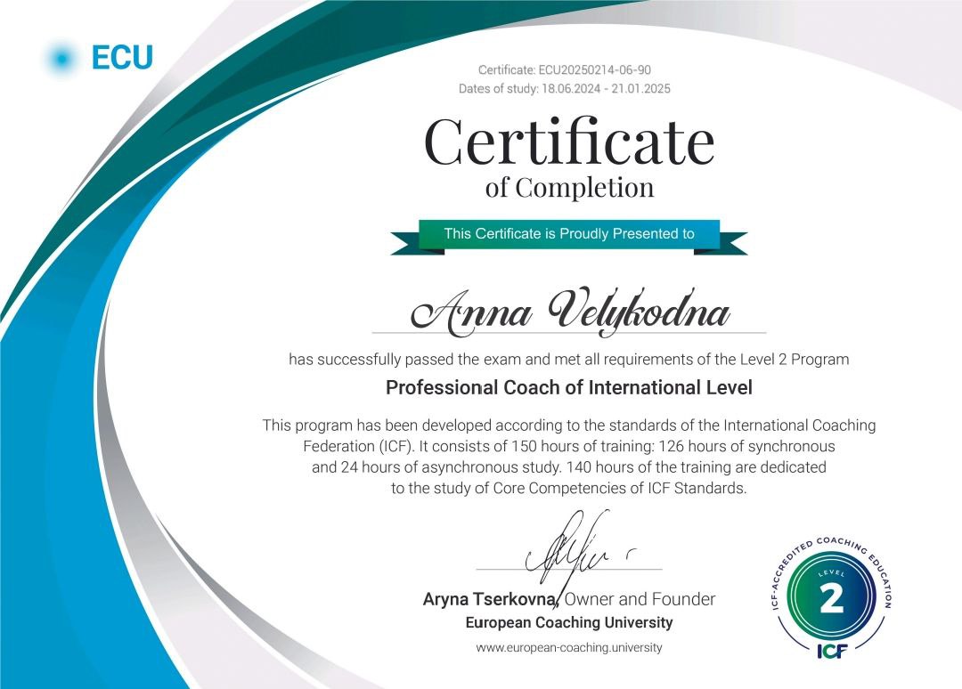 Сертифицированный коуч Международной федерации коучинга ICF.