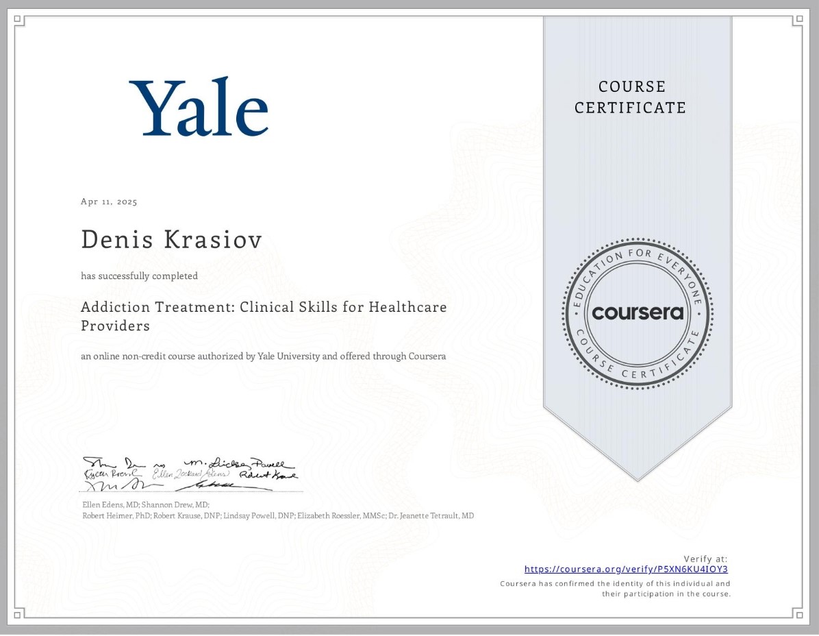 - Сертификат Addiction Treatment: Clinical Skills for Healthcare Providers с 2025 года