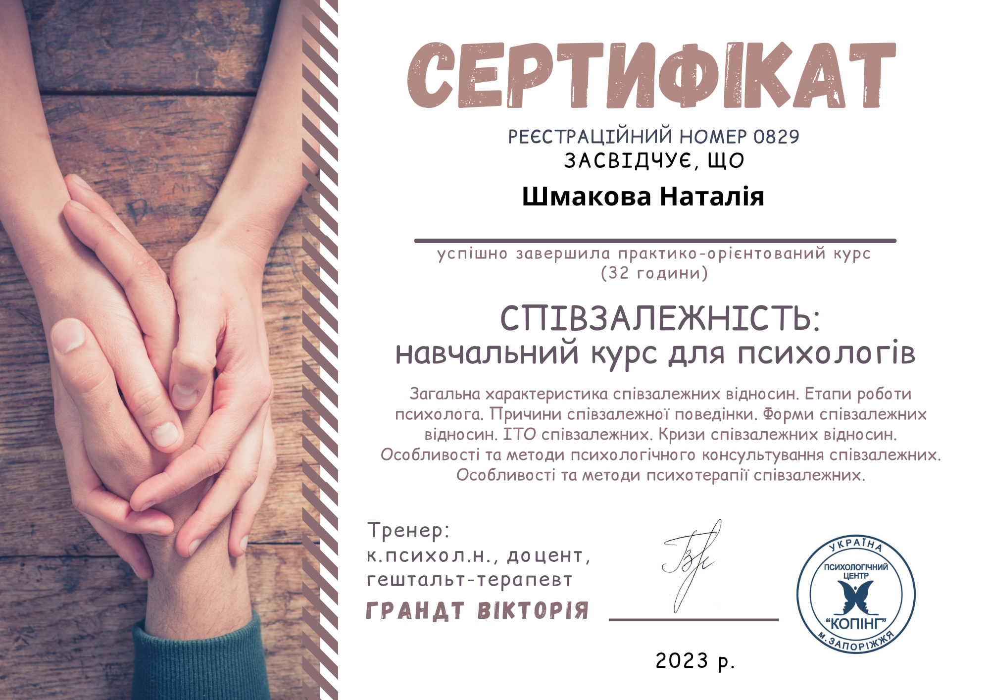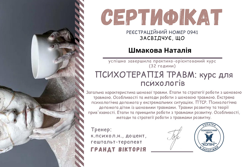 - Сертификат "Психотерапия психотравм" с 2021 года