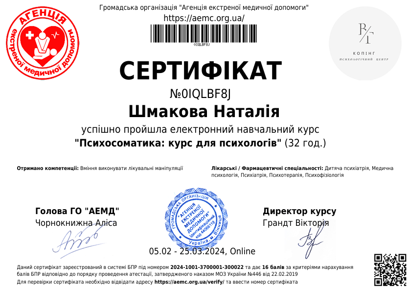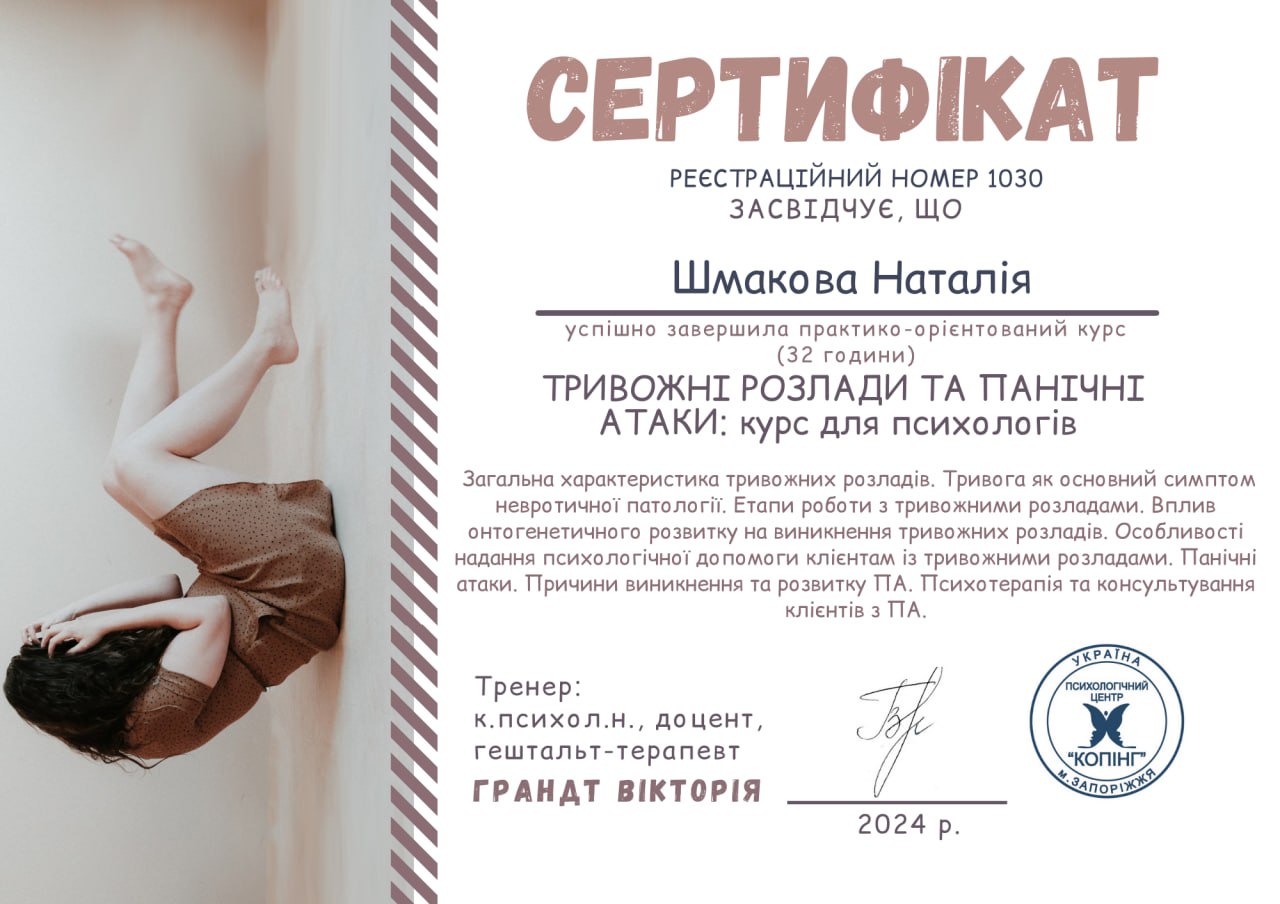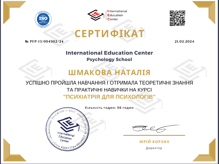 - Сертификат "Психиатрия для психологов" с 2024 года
