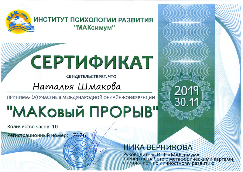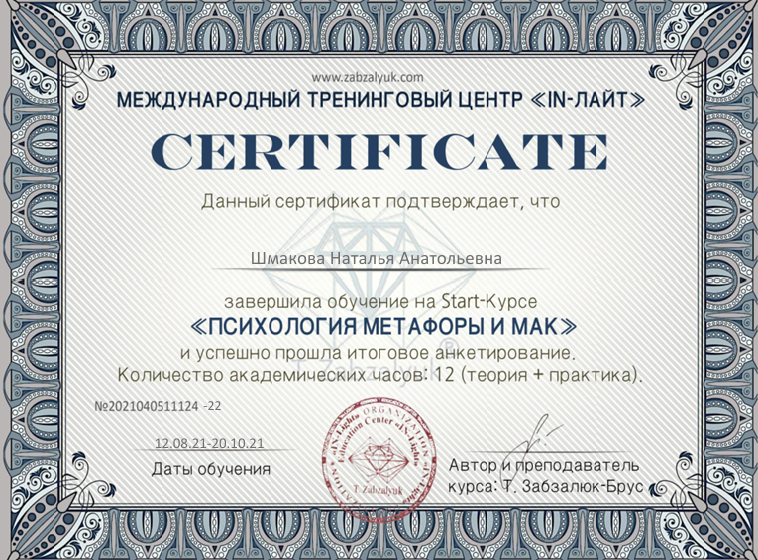 - Сертификат "Психология Метафоры и МАК" с 2024 года