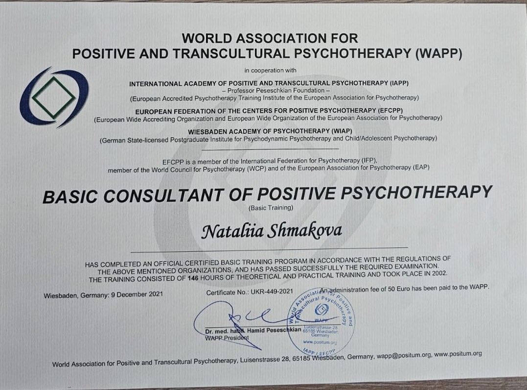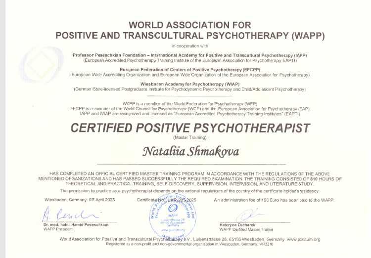 Здравствуйте! Меня зовут Наталья, и я практикующий психолог, сертифицированный психотерапевт в методе Позитивная и Транскультуральная Психотерапия Н. Пезешкиана.