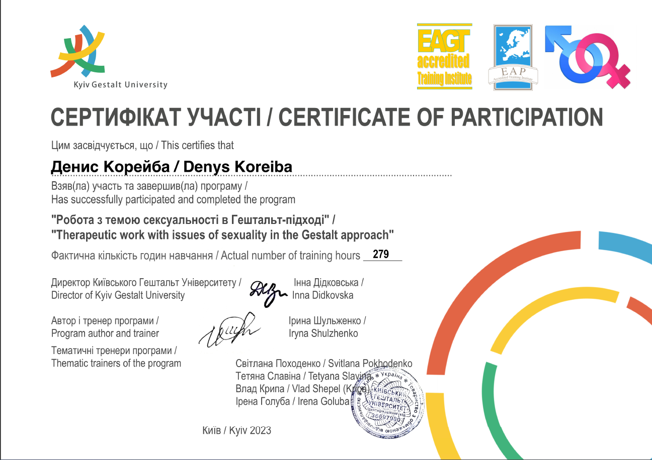 - Сертификат Работа с темой сексуальности в гештальт подходе с 2023 года
