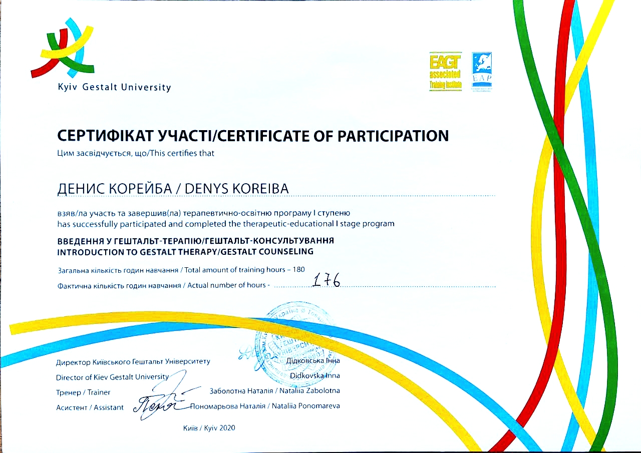 - Сертификат Введиние в гештальт терапию с 2020 года