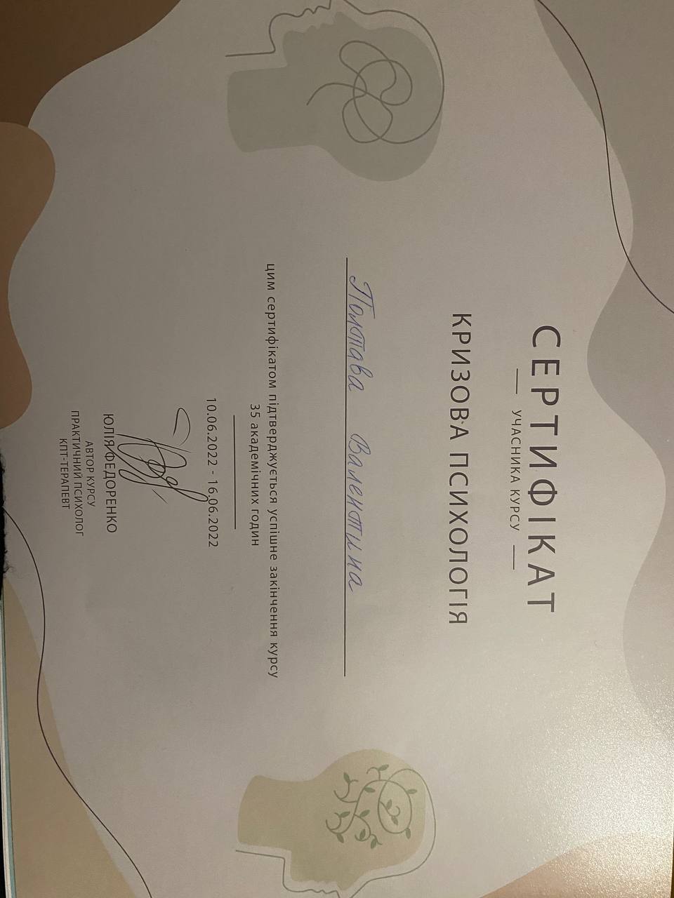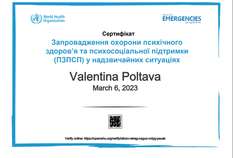 - Сертификат Запровадження охорони психічногоздоров’я та психосоціальної підтримки(ПЗПСП) у надзвичайних ситуаціях с 2022 года