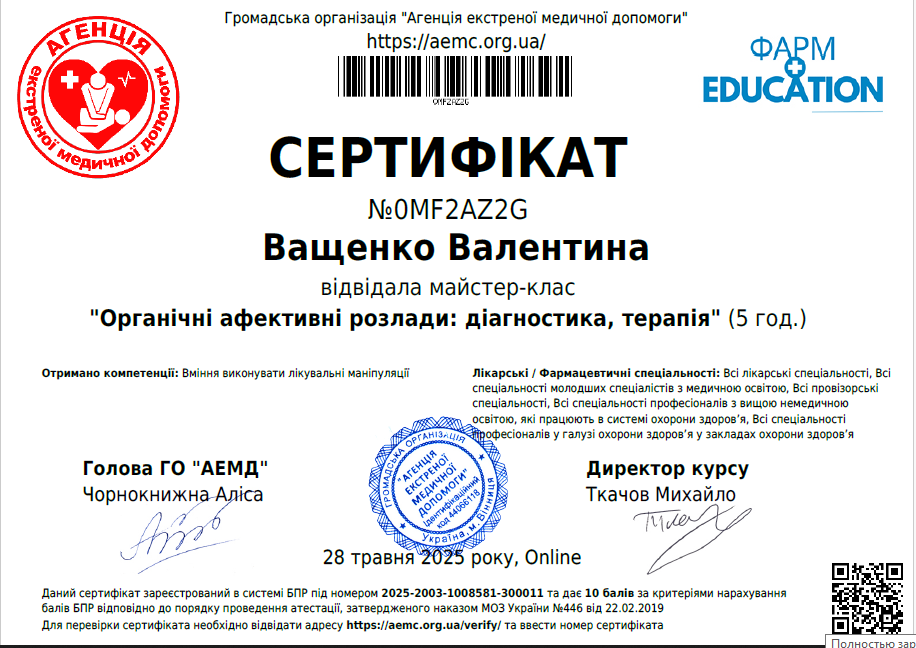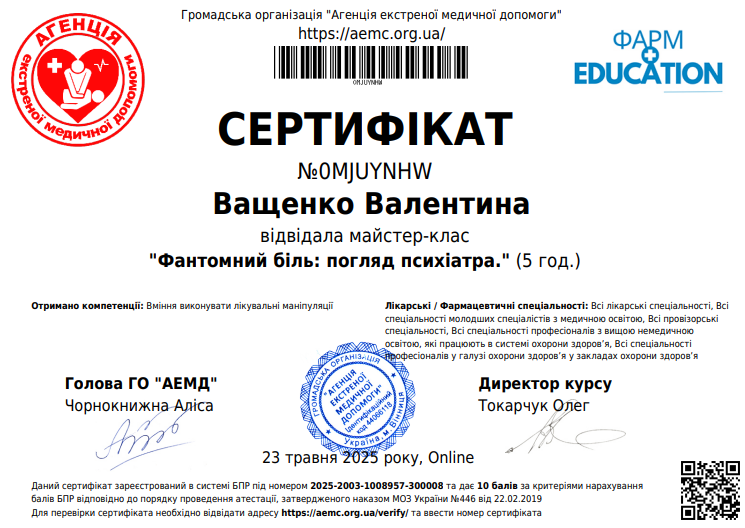 - Сертификат Метафорічні асоціативні карти в роботі з психотравмою с 2023 года