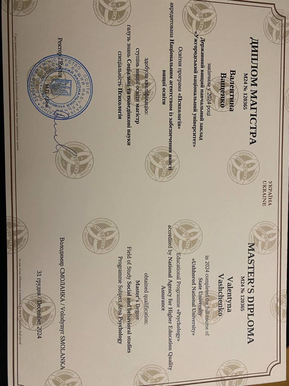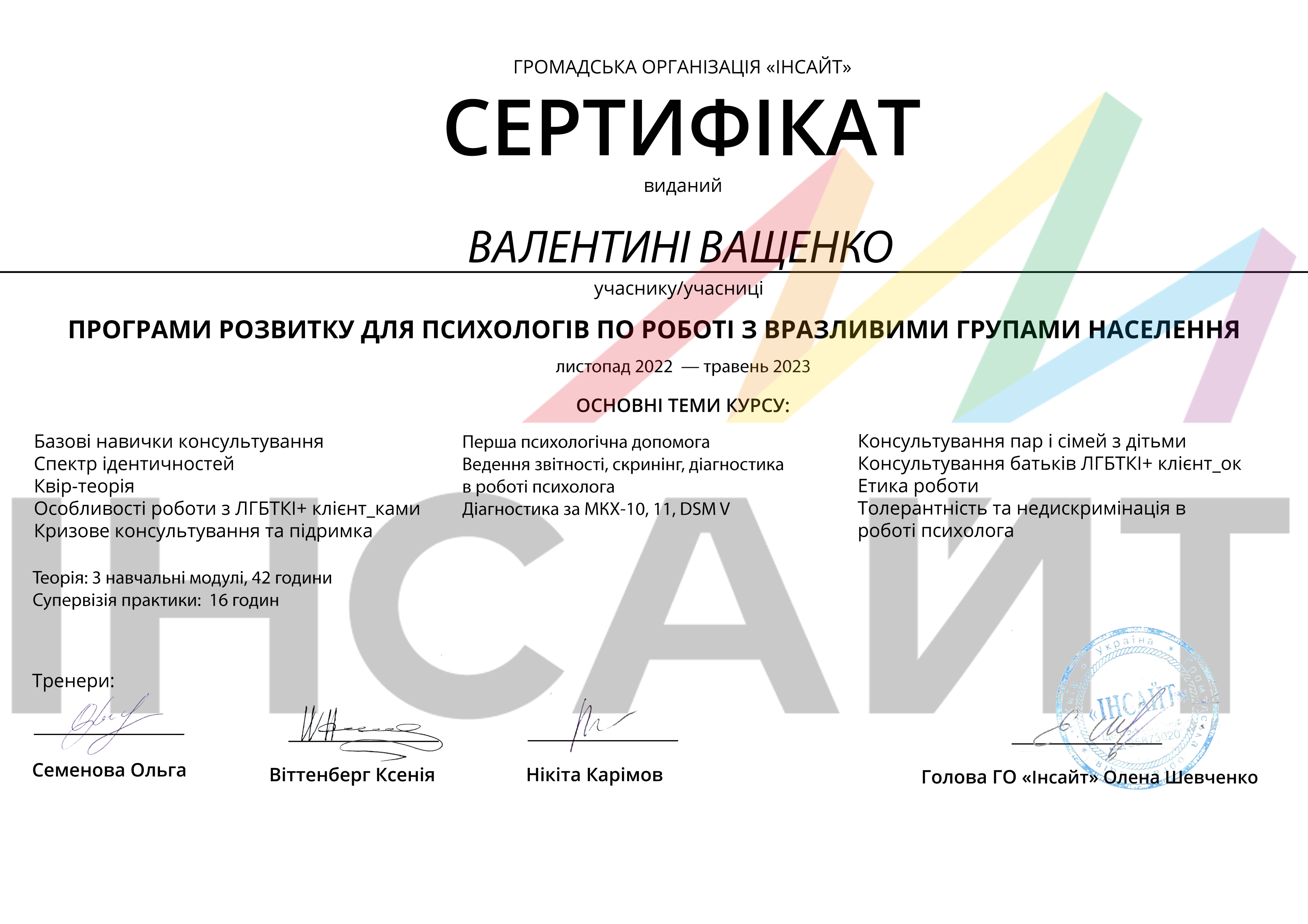 - Сертификат Програма розвитку для психологів по роботі з вразливими групами населення с 2023 года