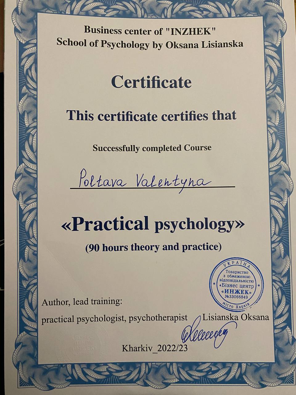 - Сертификат Бізнес Центр "ІНЖЕК" Школа Психології с 2022 года