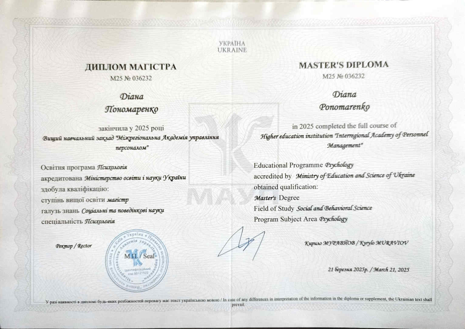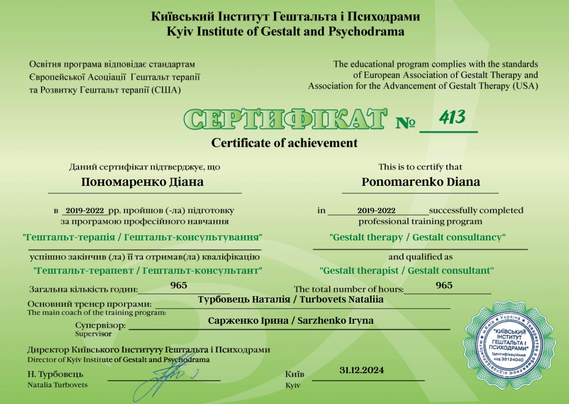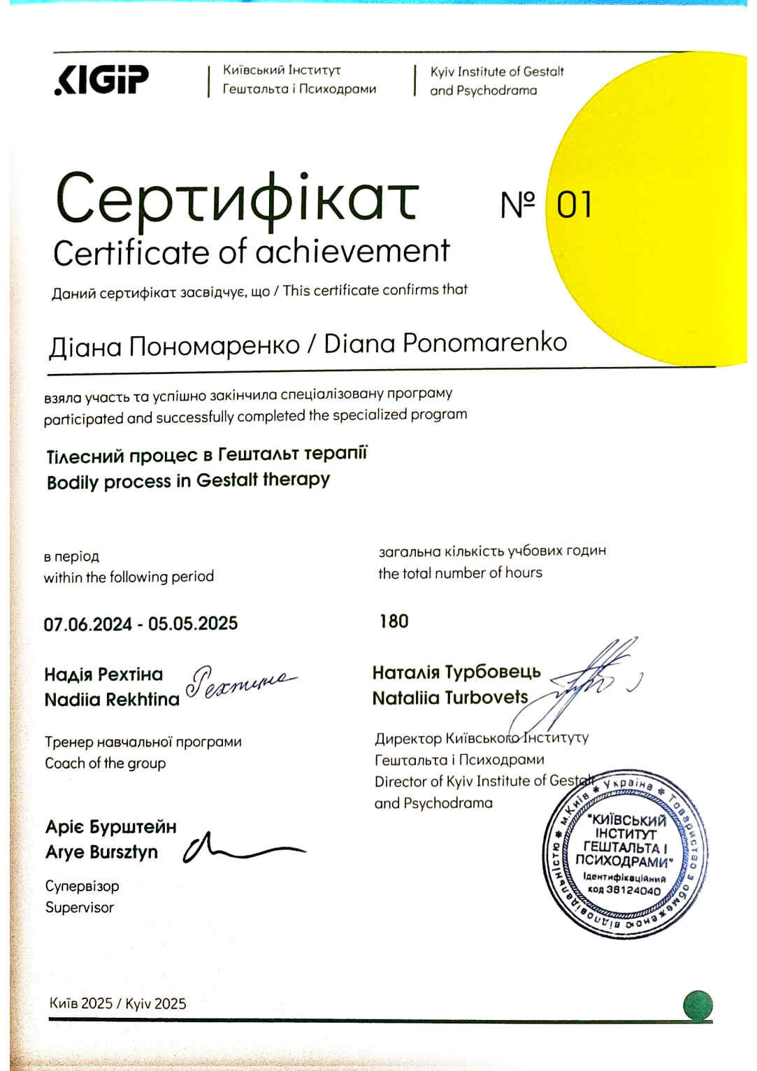- Сертификат Специализация «Телесный процесс в гештальт-терапии» с 2025 года