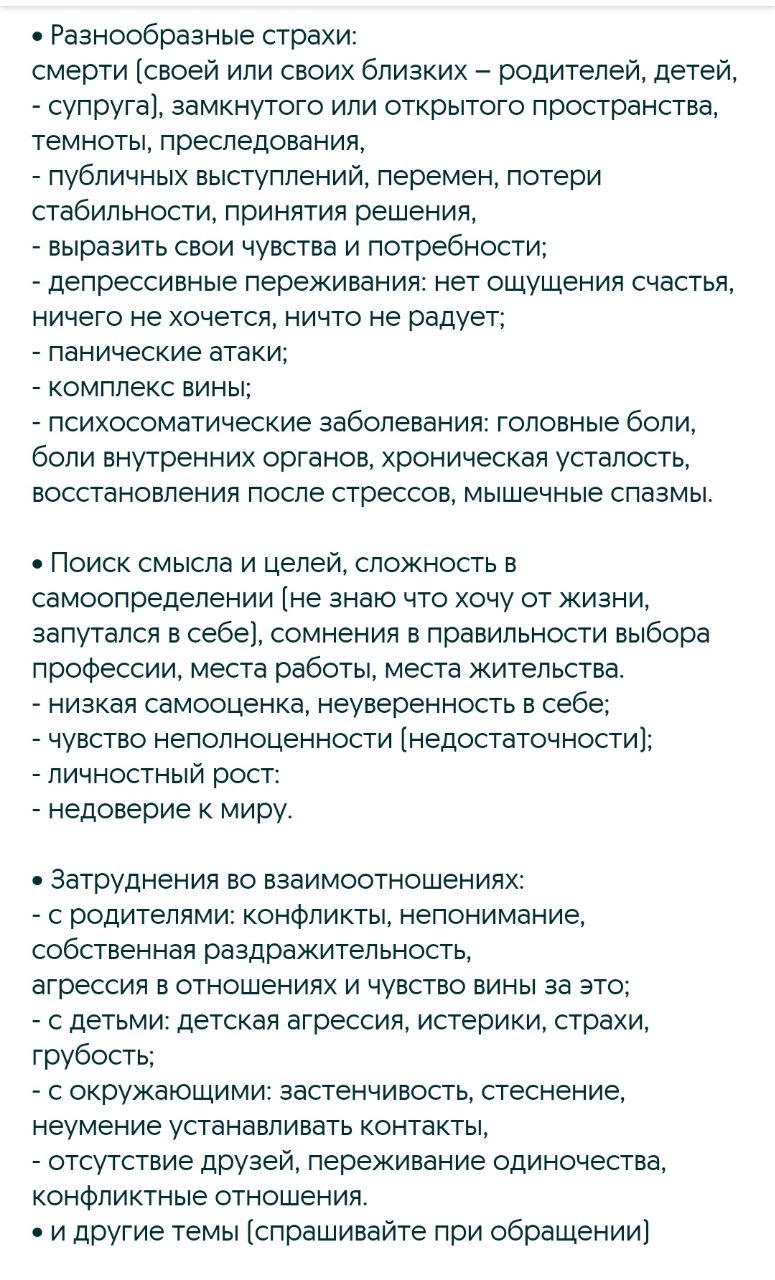 Работаю с темами утраты, расставания, сепарации, личных границ, а также с отсутствием отношений и страхом близости. Сопровождаю в периоды смены профессии, переезда, выгорания и потери мотивации. Помогаю выстроить карьерный маршрут и принимать решения, которые будут опираться на ваши ценности и придавать силы.