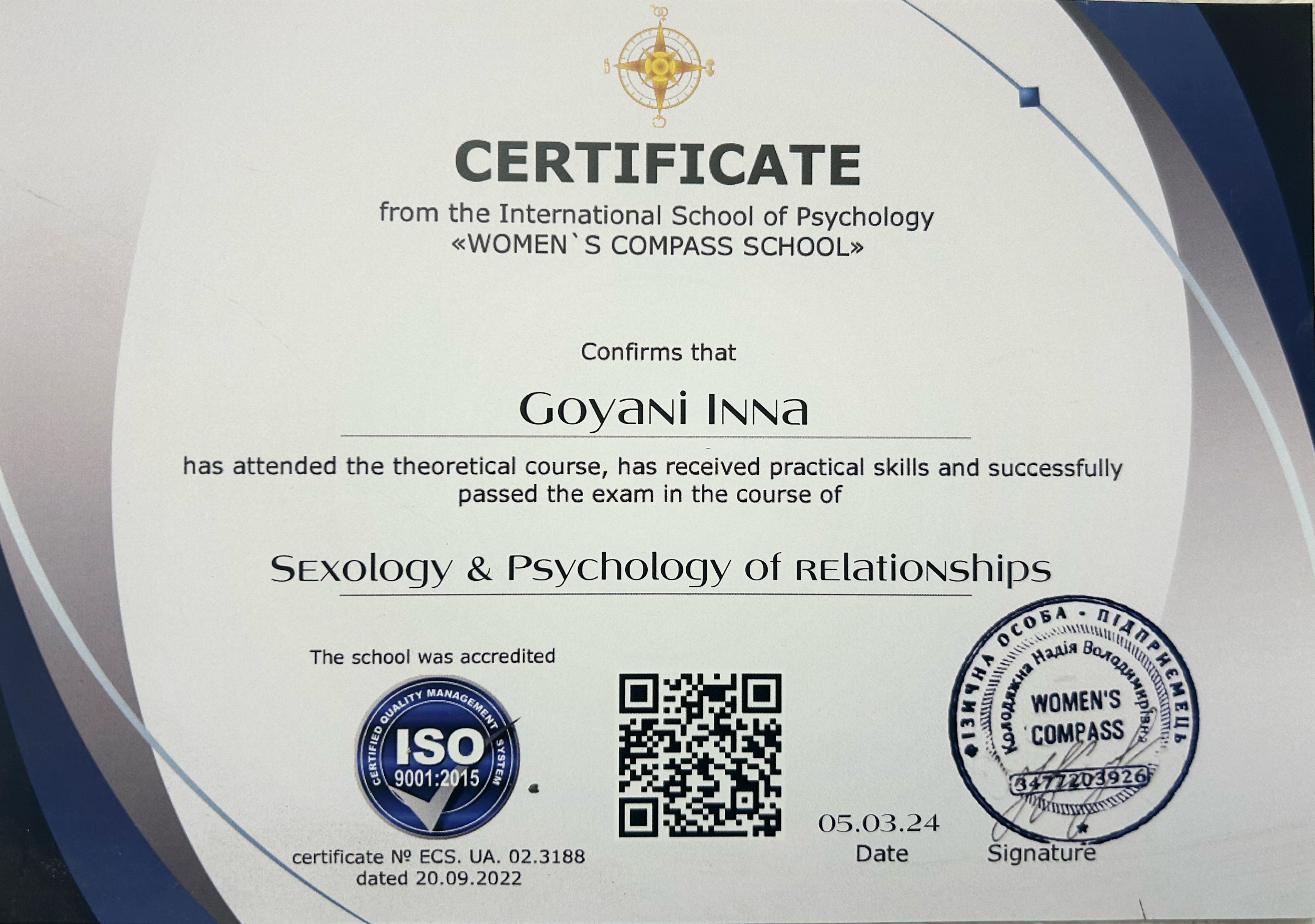 - Сертификат Сертификат сексолог-психолог с 2024 года