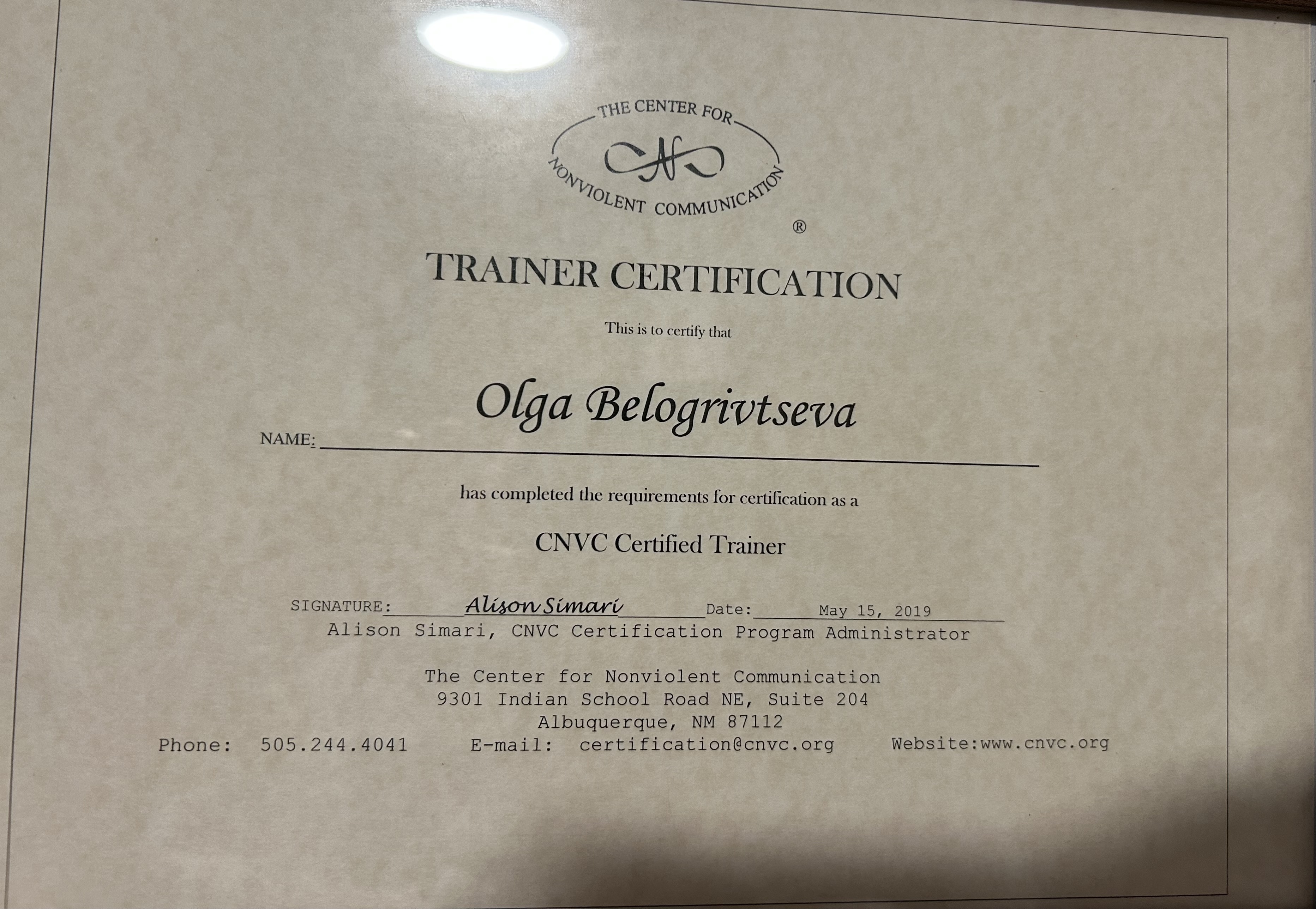 ◌ Сертифицированный тренер по ненасильственному общению с 2019 г.