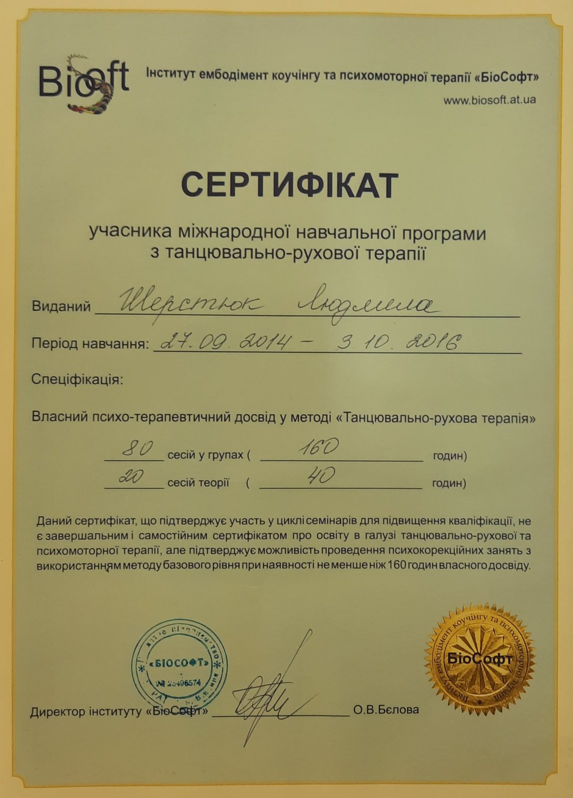 - Сертификат Международная учебная программа по танцевально-двигательной терапии, эмбодименту коучинга и психомоторной терапии «БиоСофт» с 2016 года