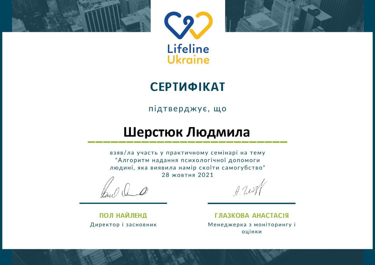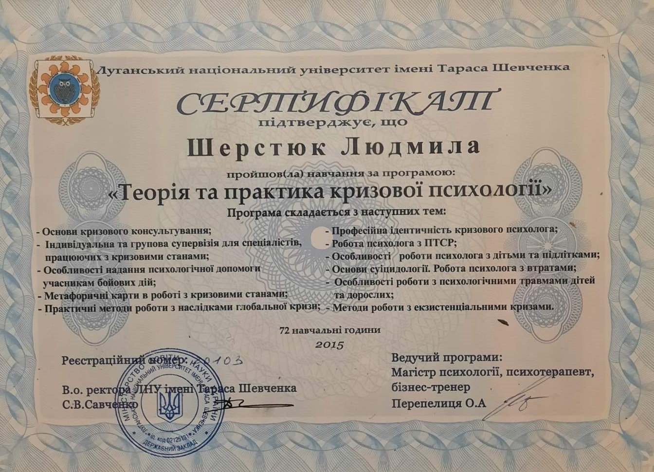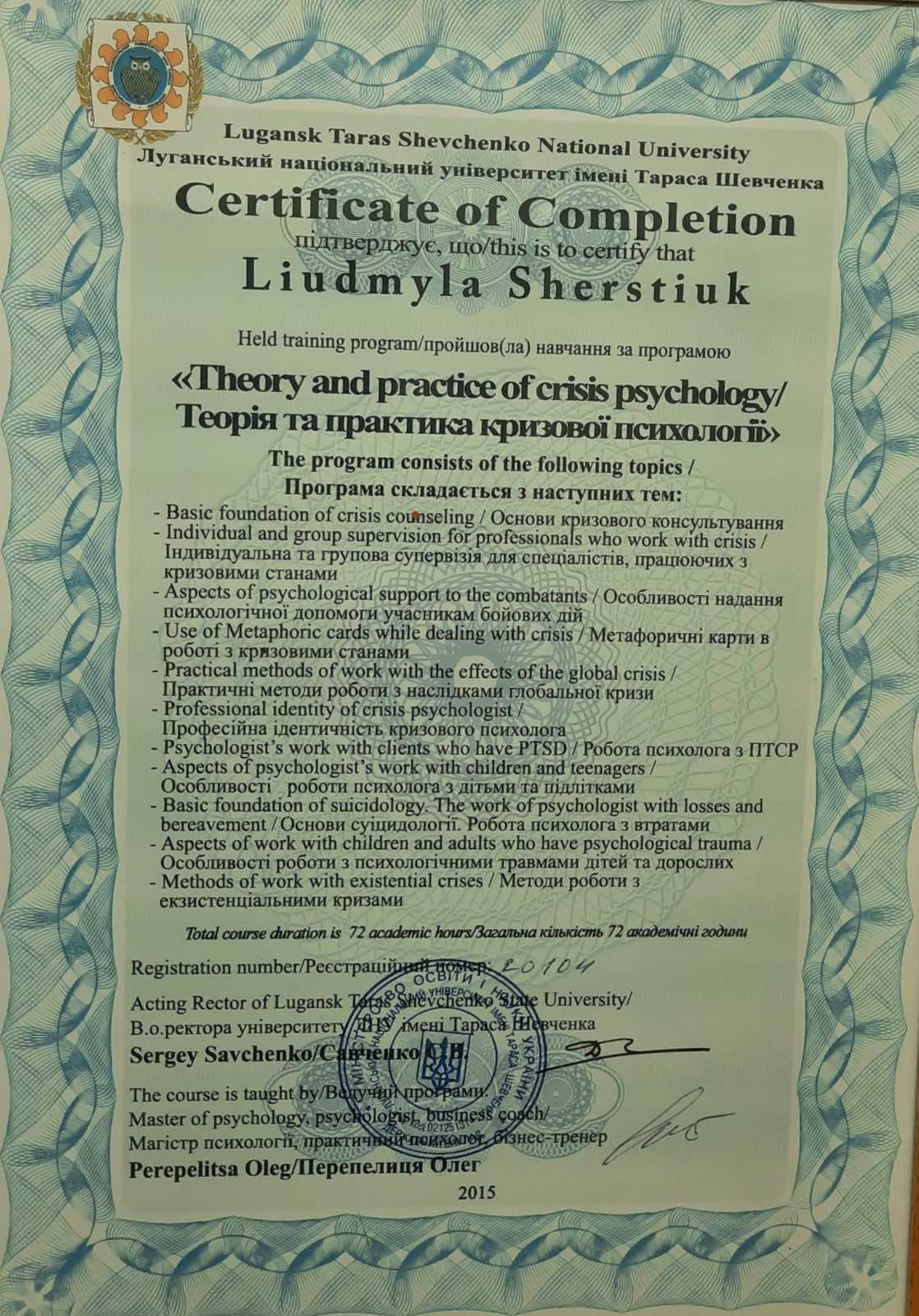 - Сертификат "Теория и практика кризисной психологии" с 2015 года