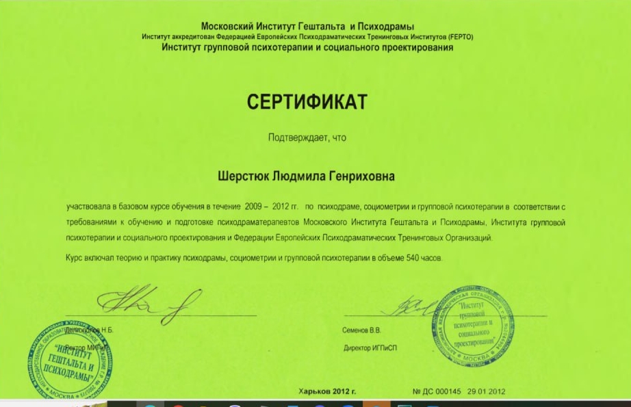 - Сертификат Психодрама и ролевые игры в индивидуальной и групповой терапии с 2012 года