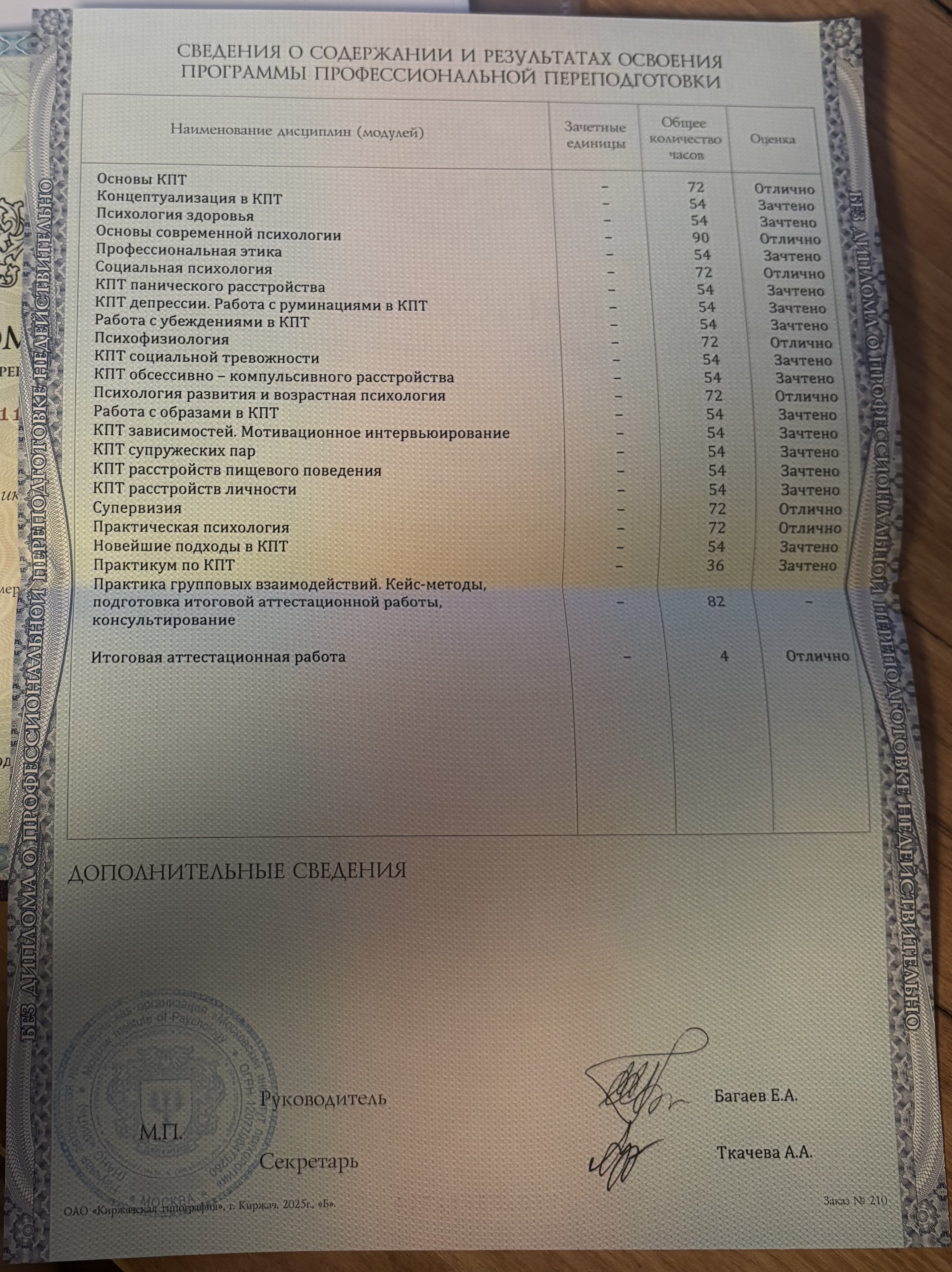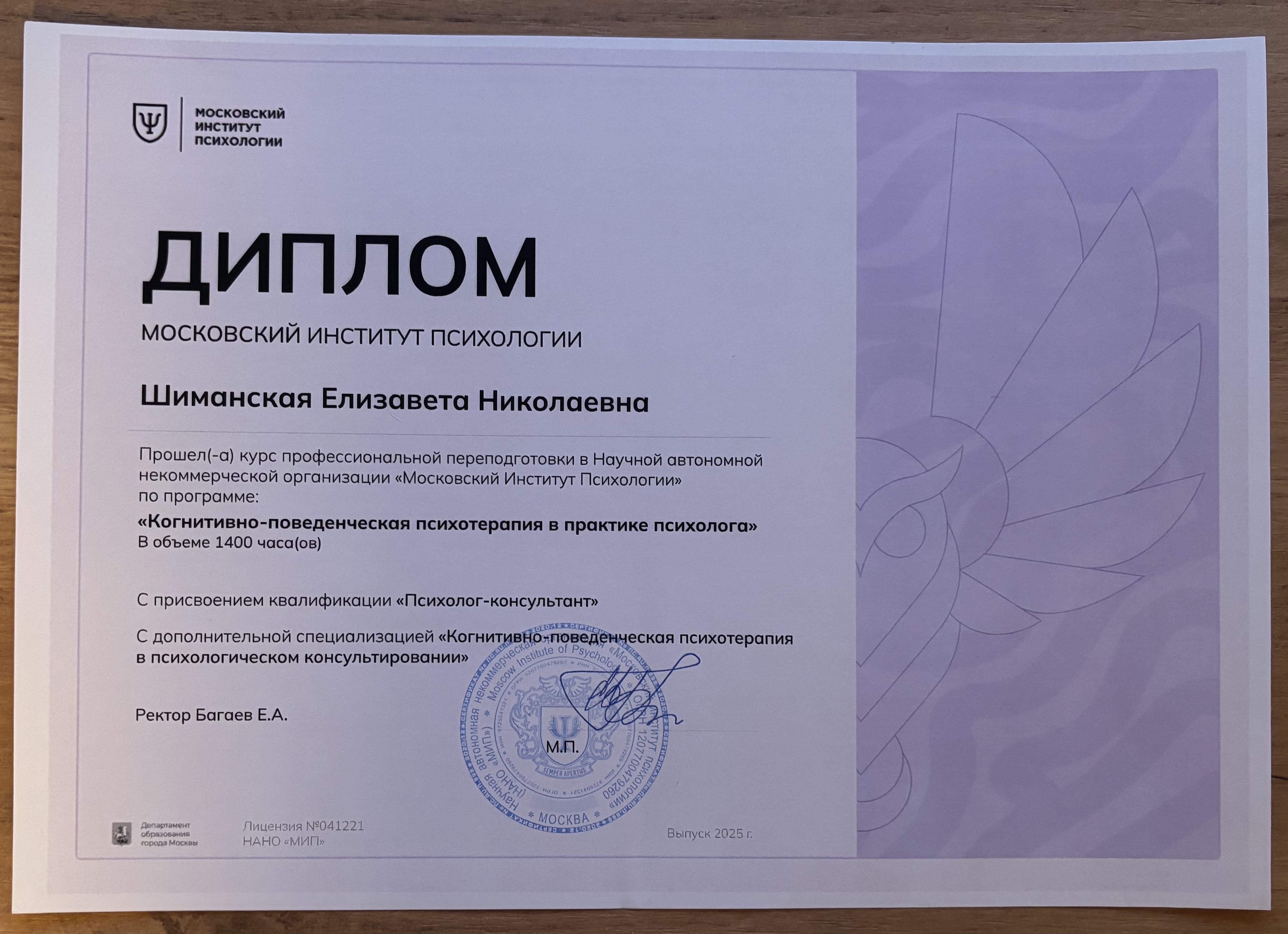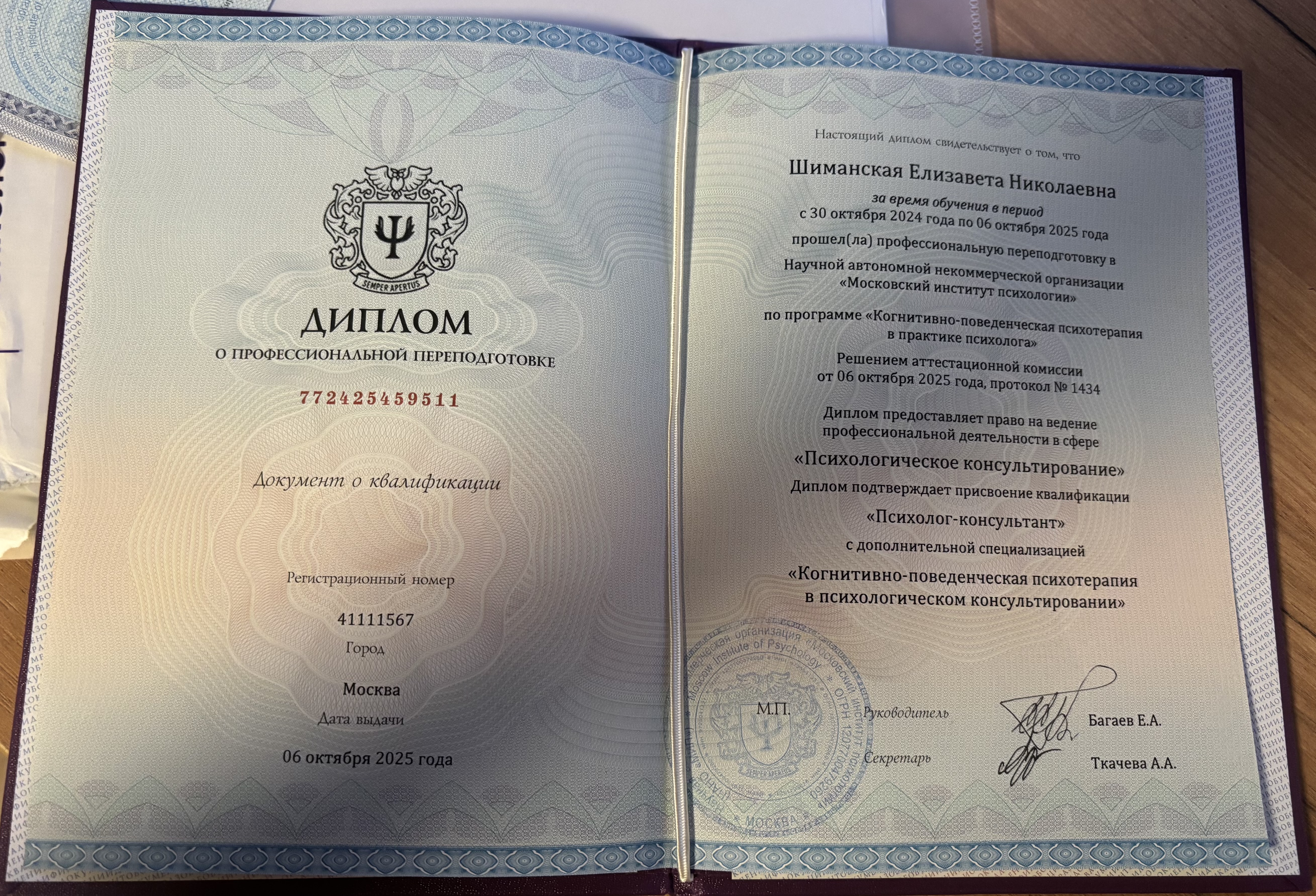 Я окончила Московский институт психологии по специализации «Когнитивно-поведенческая психотерапия в психологическом консультировании».