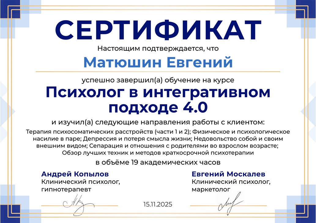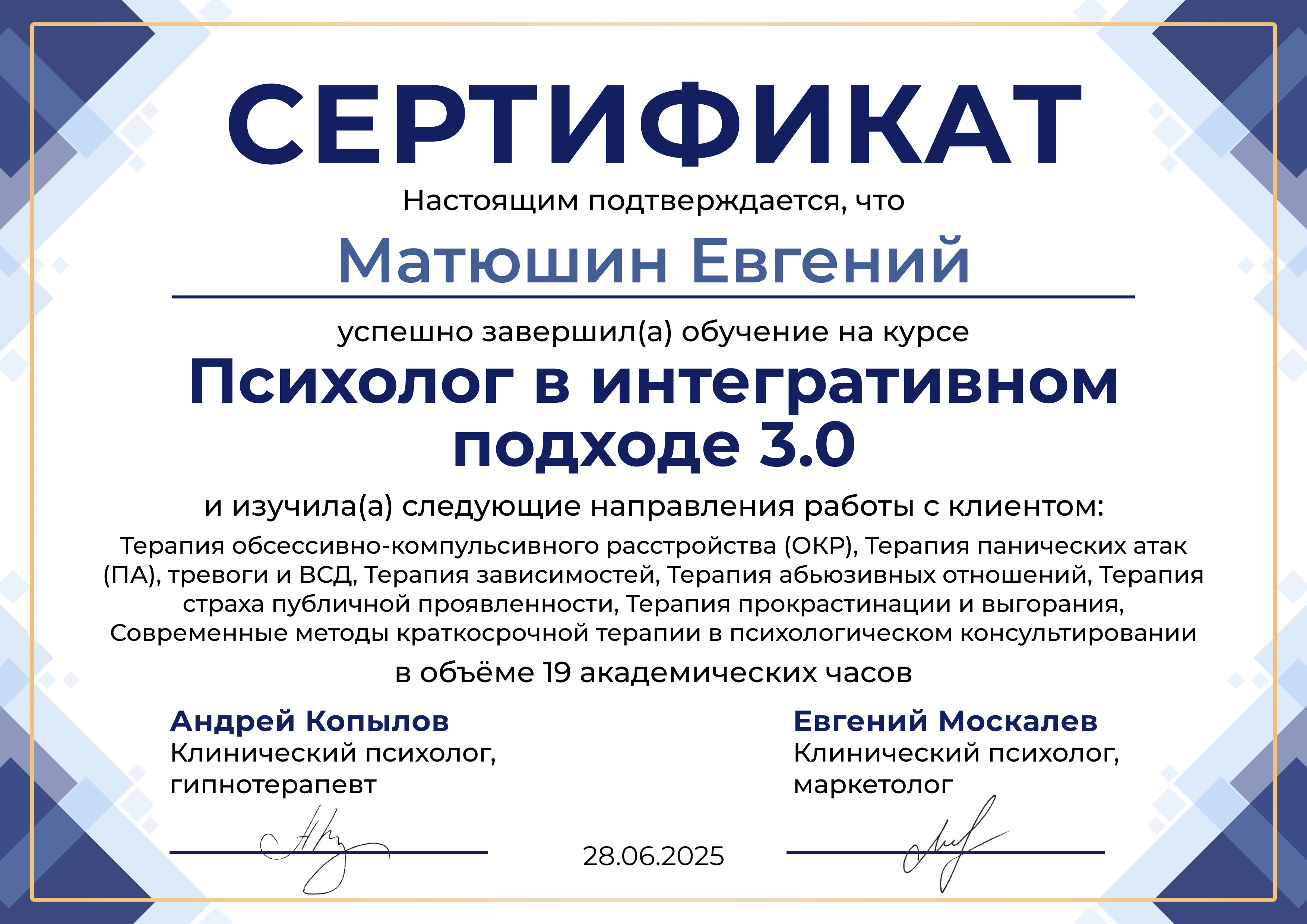 - Сертификат Психолог в интегративном подходе 3.0 с 2025 года