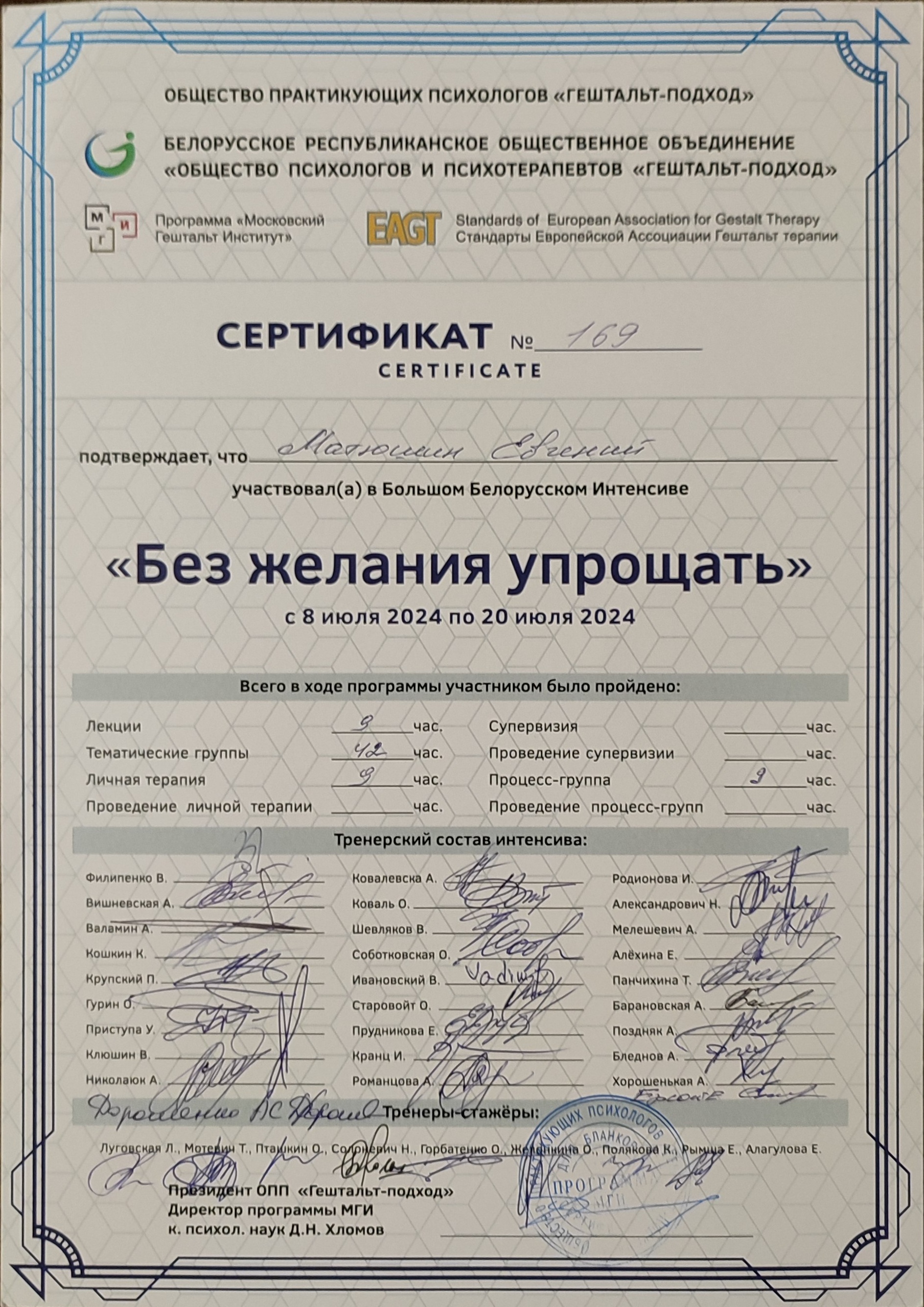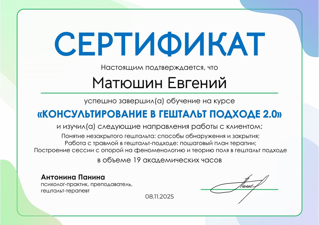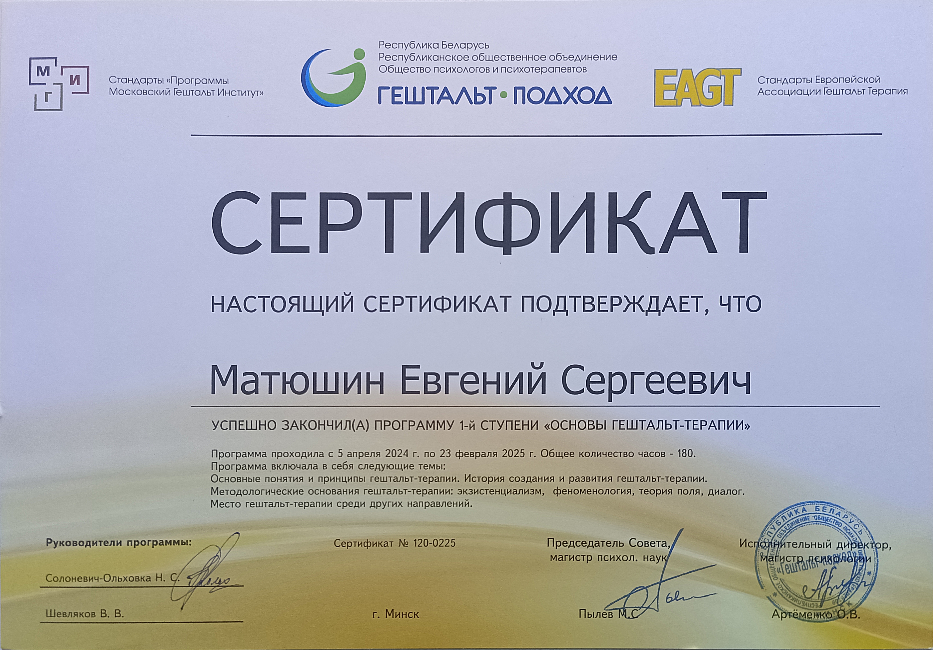 - Сертификат 1-я ступень "Основы гештальт-терапии" с 2025 года
