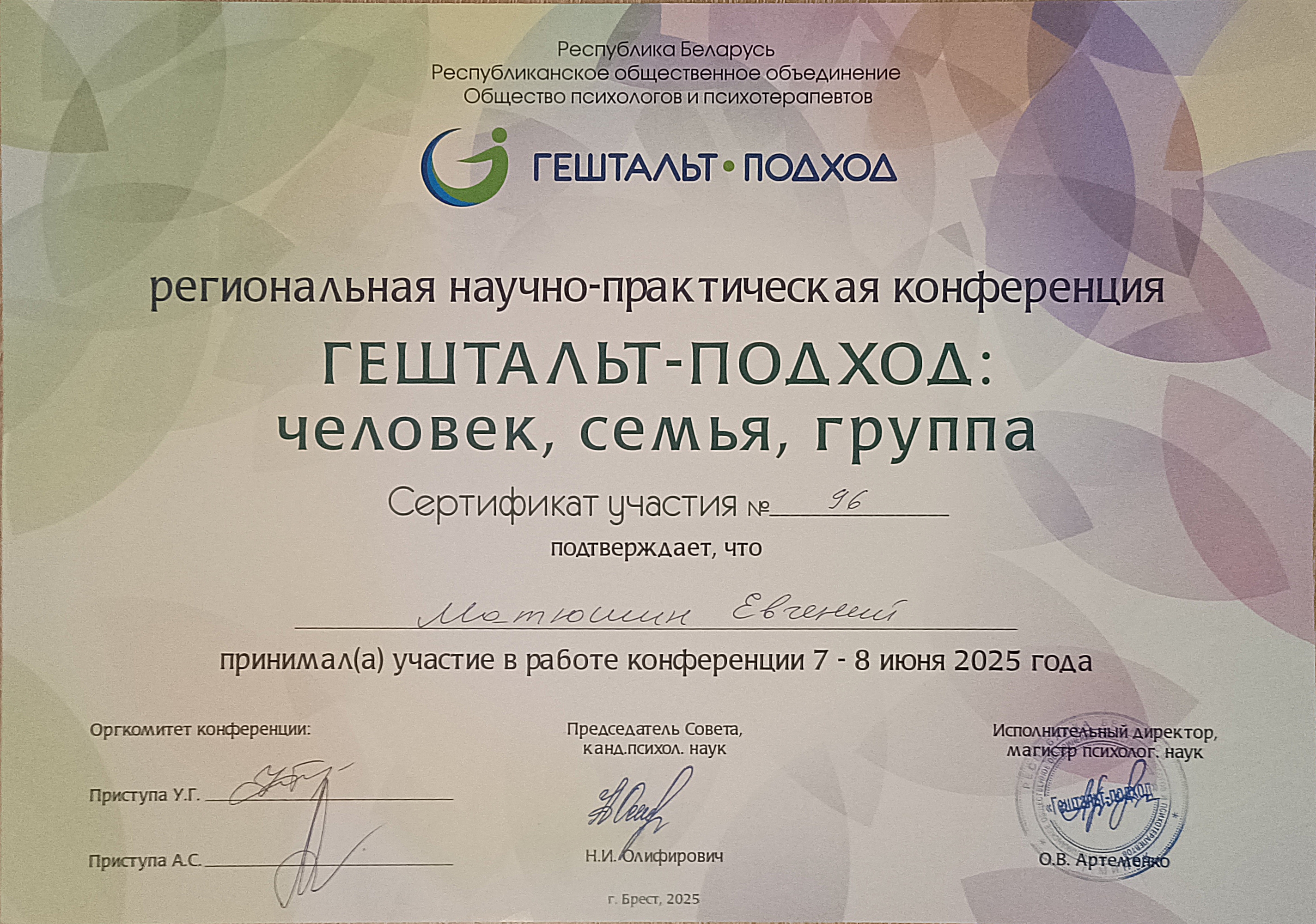 - Сертификат Региональная научно-практическая конференция Гештальт-подход: человек, семья, группа с 2025 года
