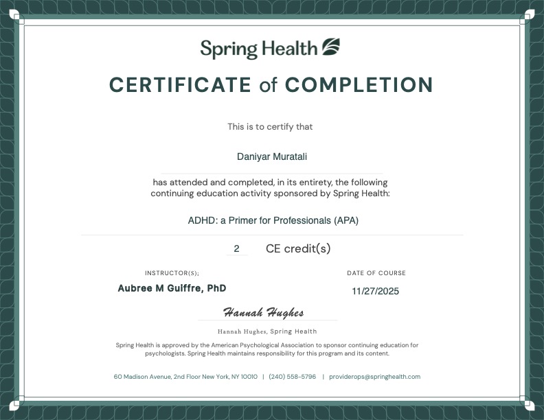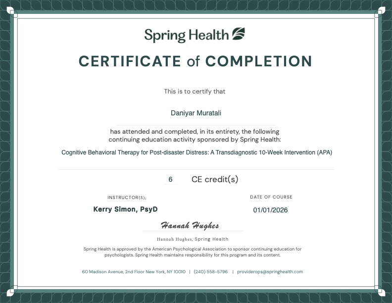 - Сертификат Когнитивно-поведенческая терапия для лечения посттравматического стресса: трансдиагностическая 10-недельная интервенция с 2025 года