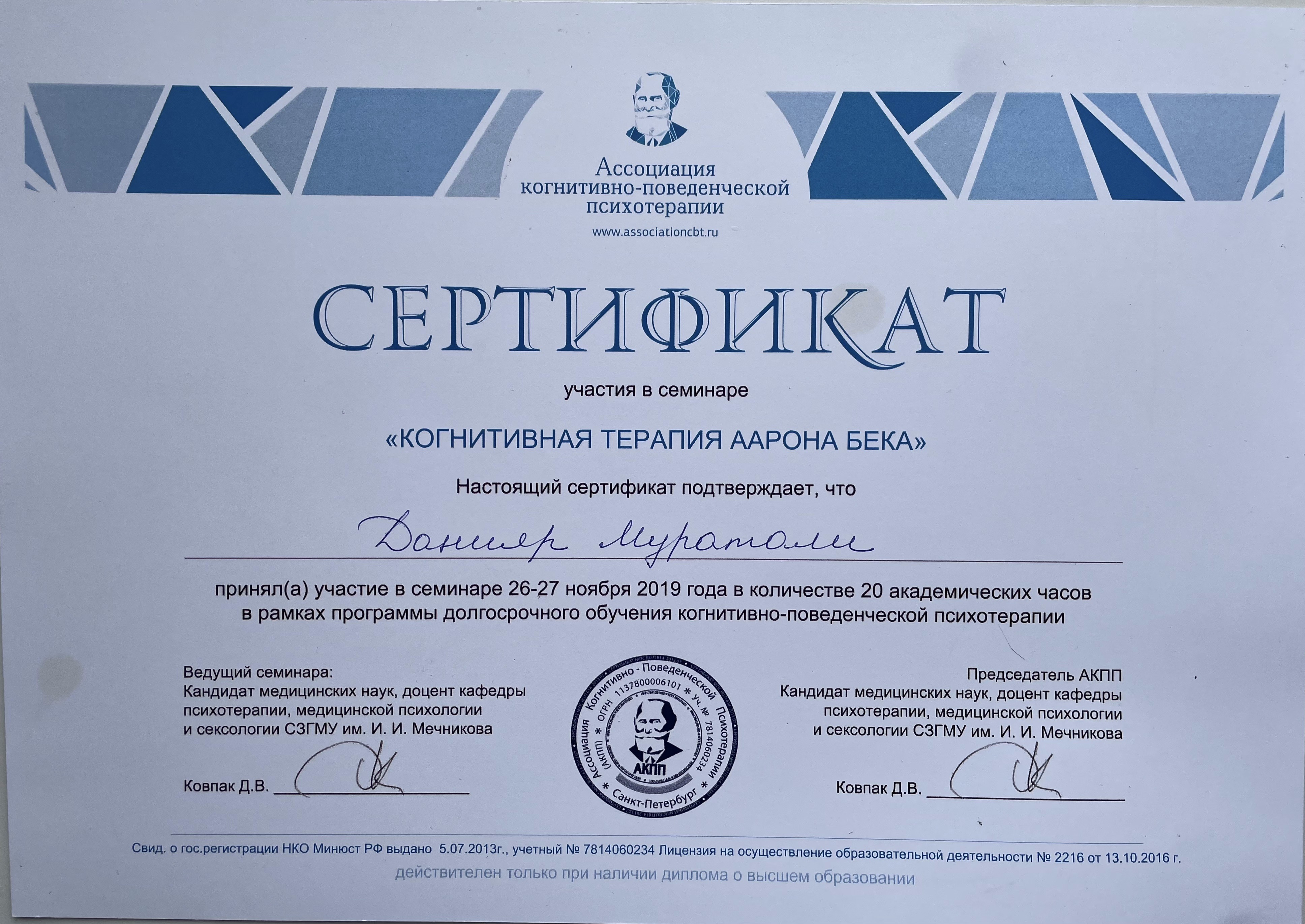 - Сертификат Когнитивная терапия Арона Бека с 2019 года