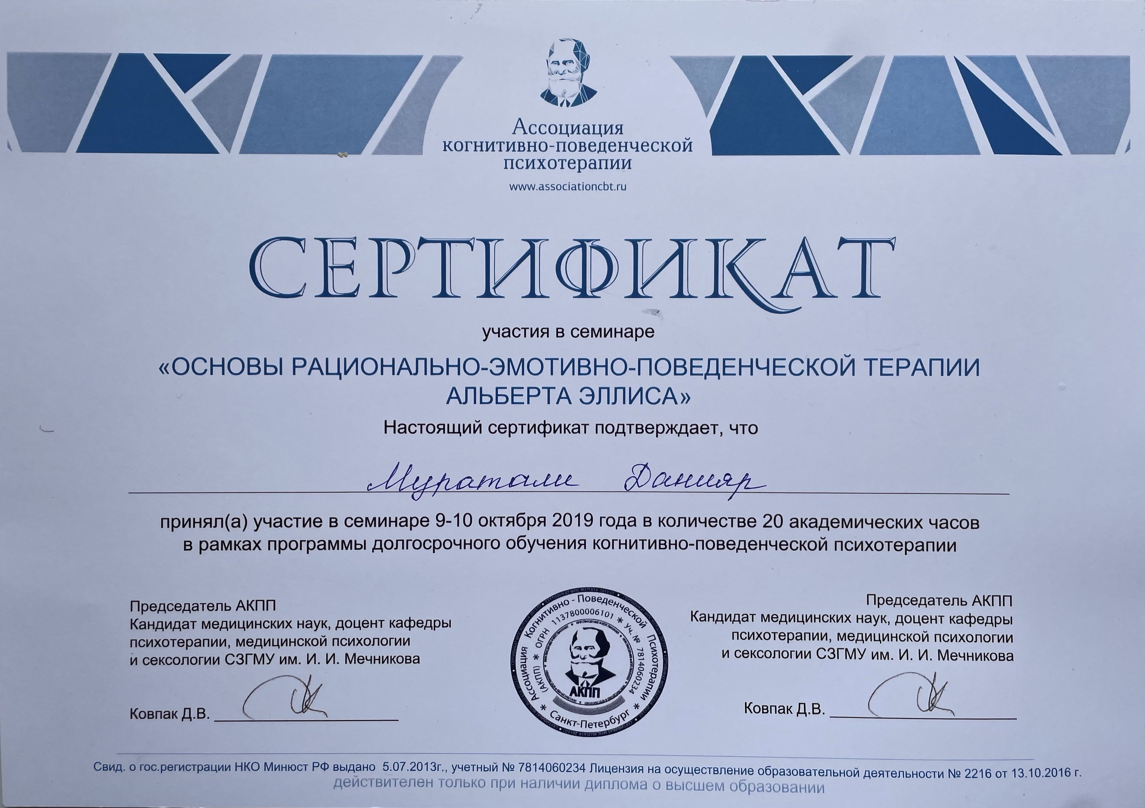 - Сертификат Основы рационально-эмотивно-поведенческой терапии Альберта Элиса с 2019 года