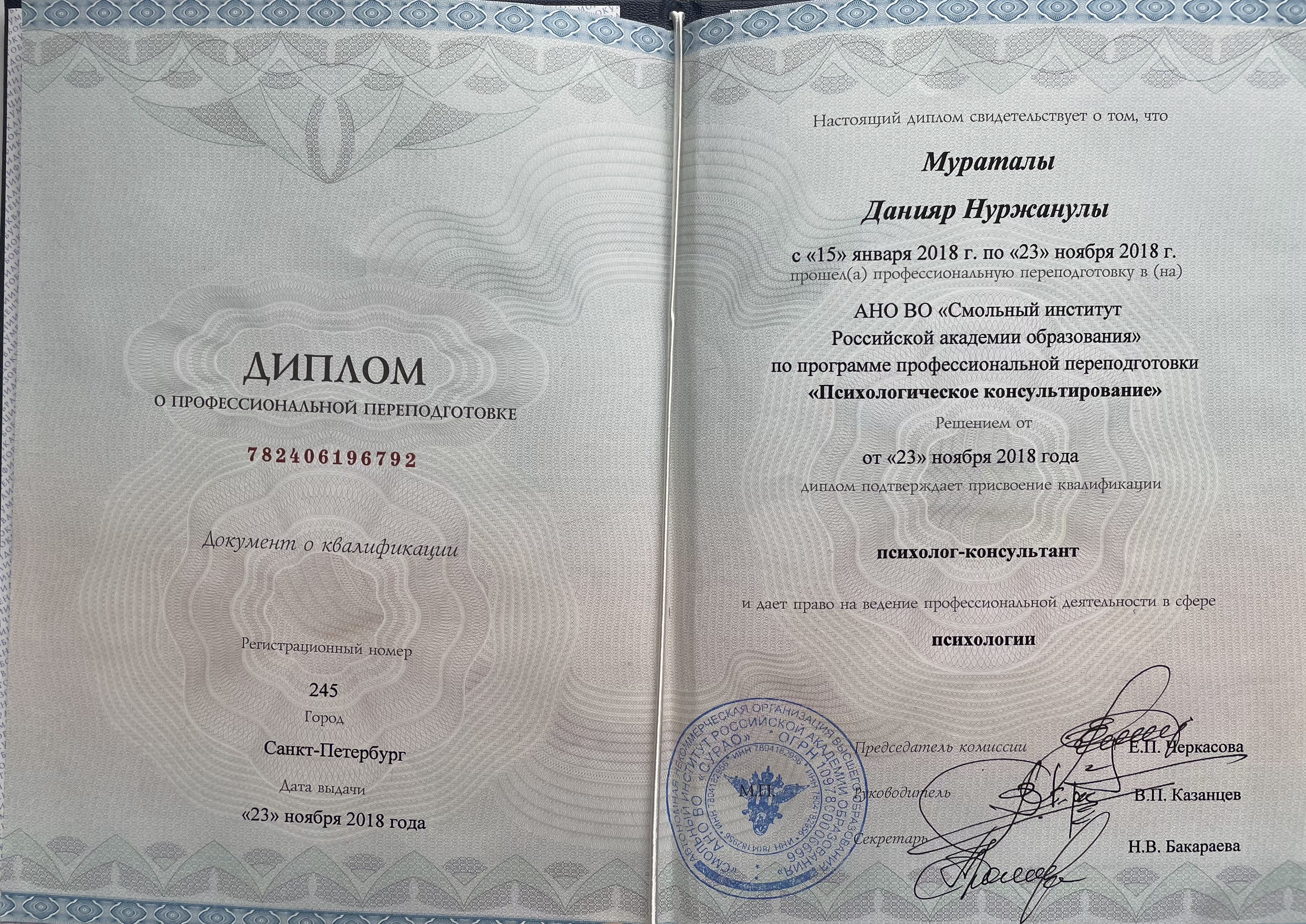 Меня зовут Данияр Муратали, я практикующий психолог, специализирующийся в когнитивно-поведенческой терапии (КПТ). С 2019 года помогаю людям справляться с тревогой, неуверенностью, внутренними конфликтами и эмоциональным выгоранием.