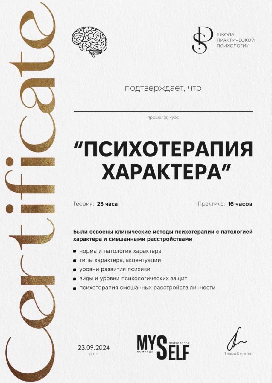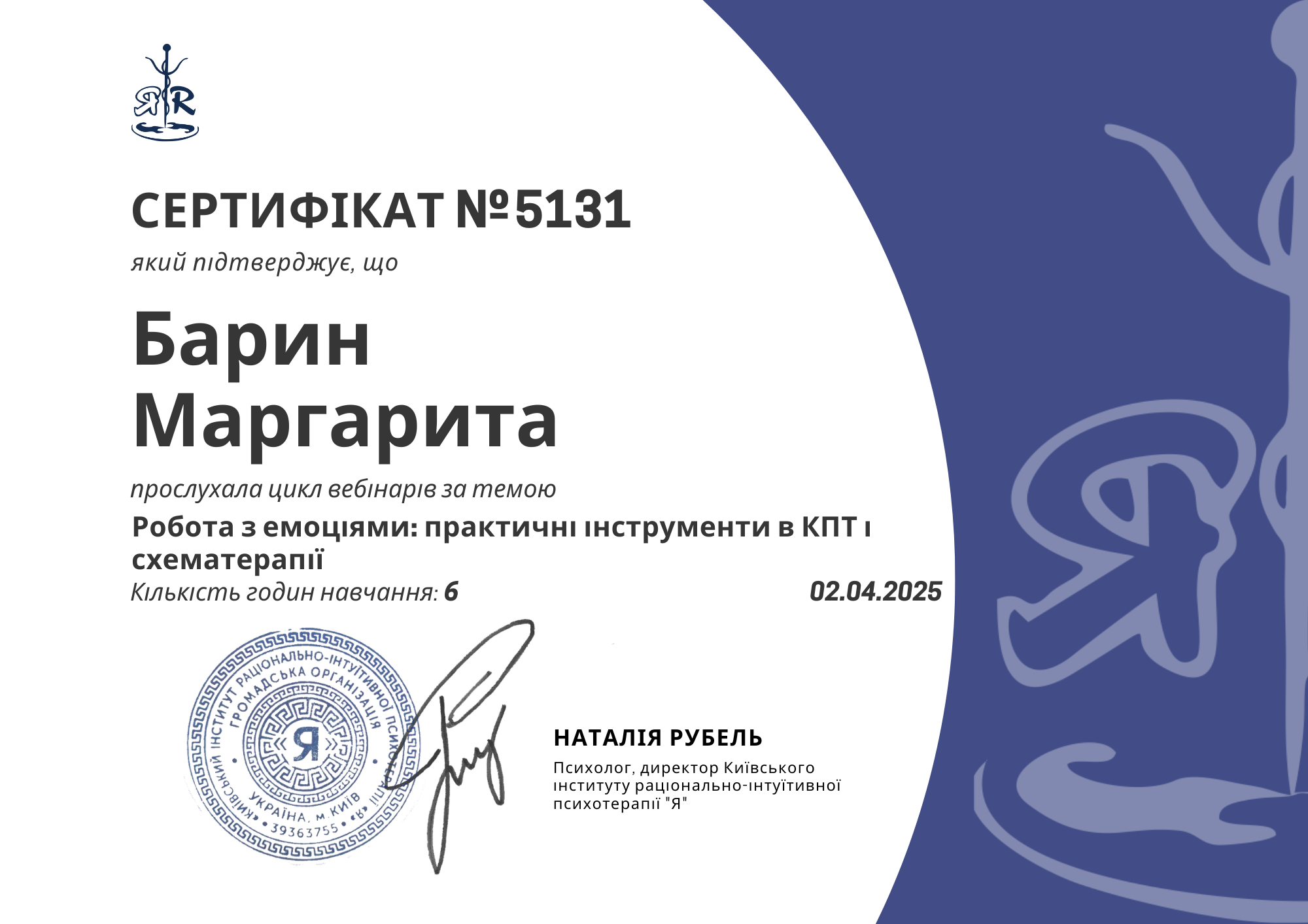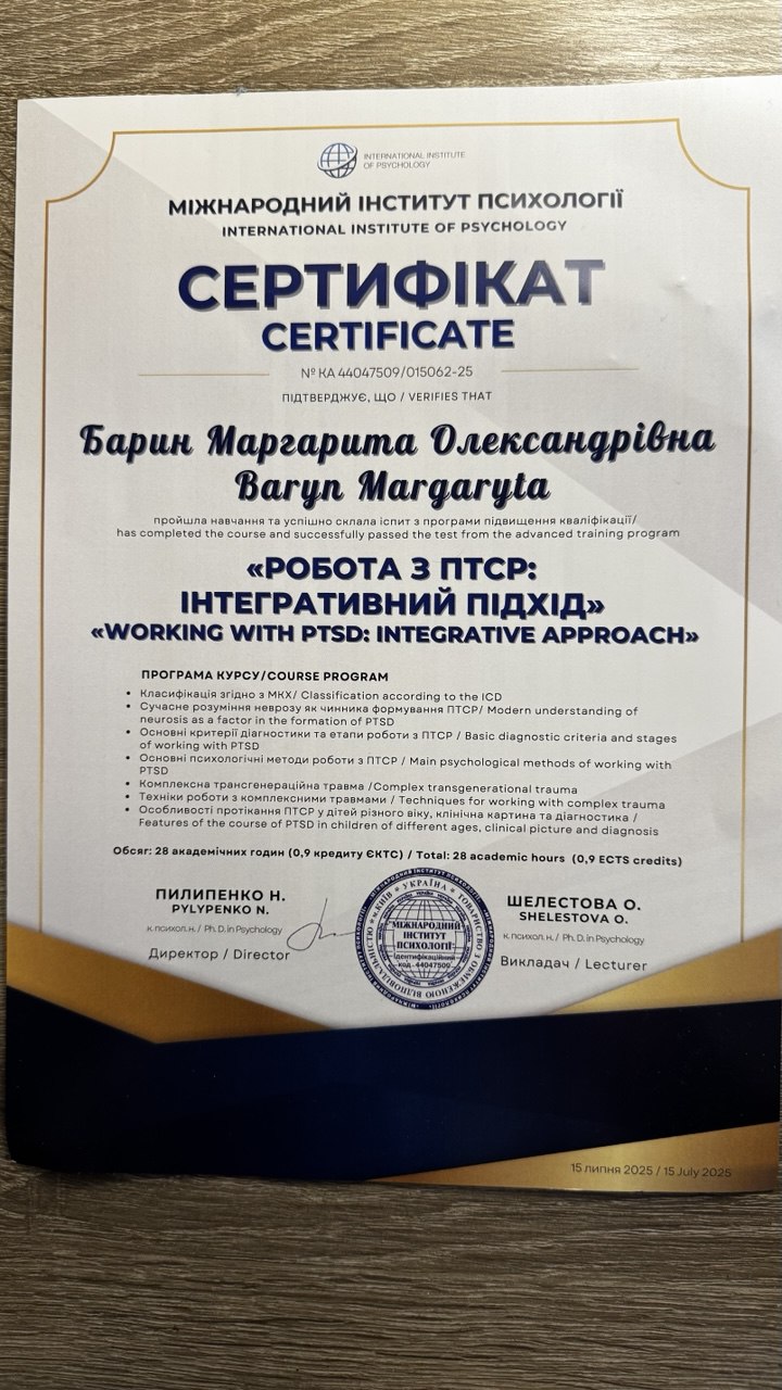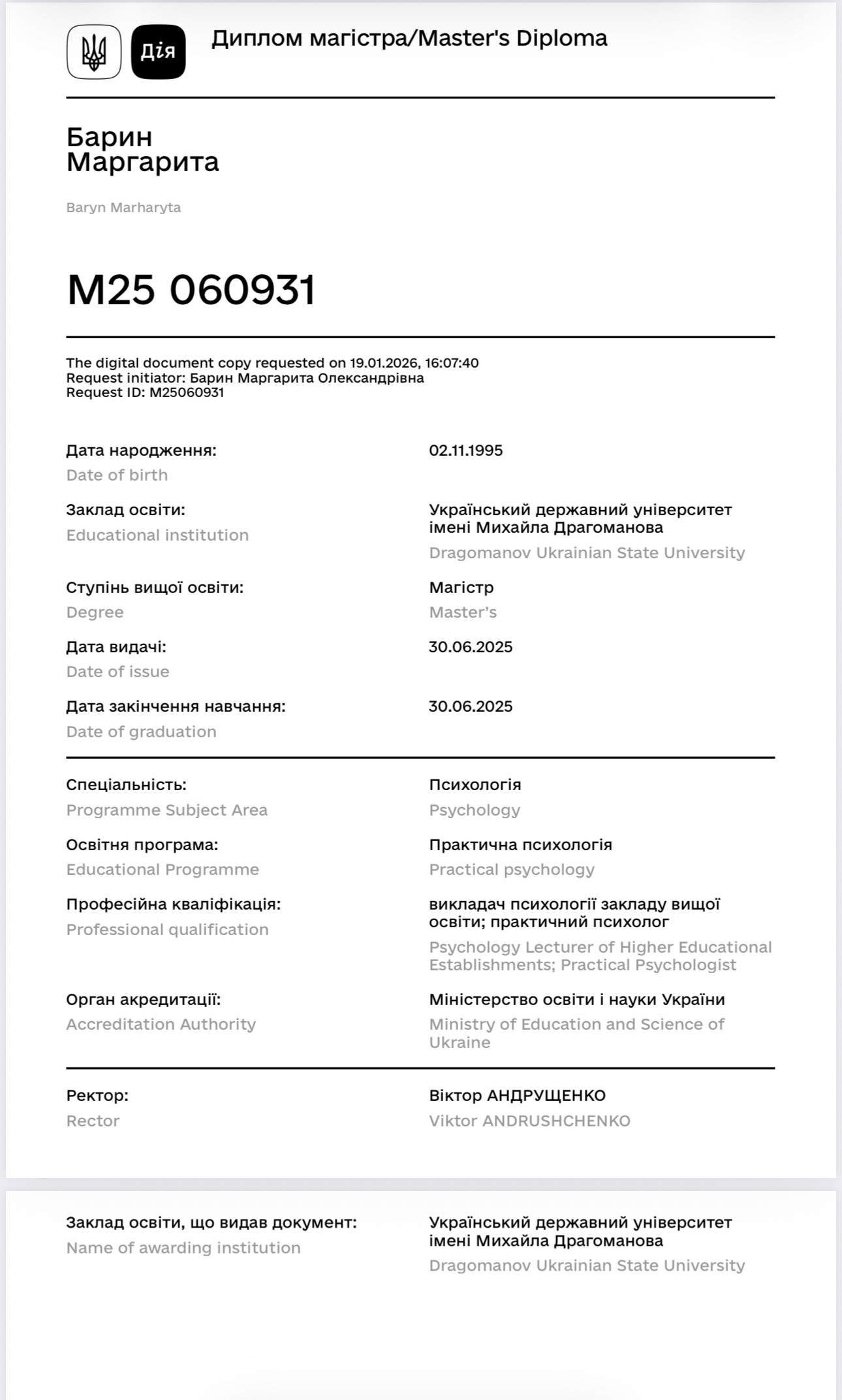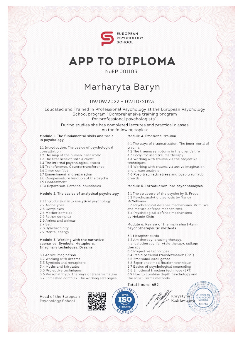 - Сертификат Професійна перепідготовка спеціальність Психологія с 2023 года