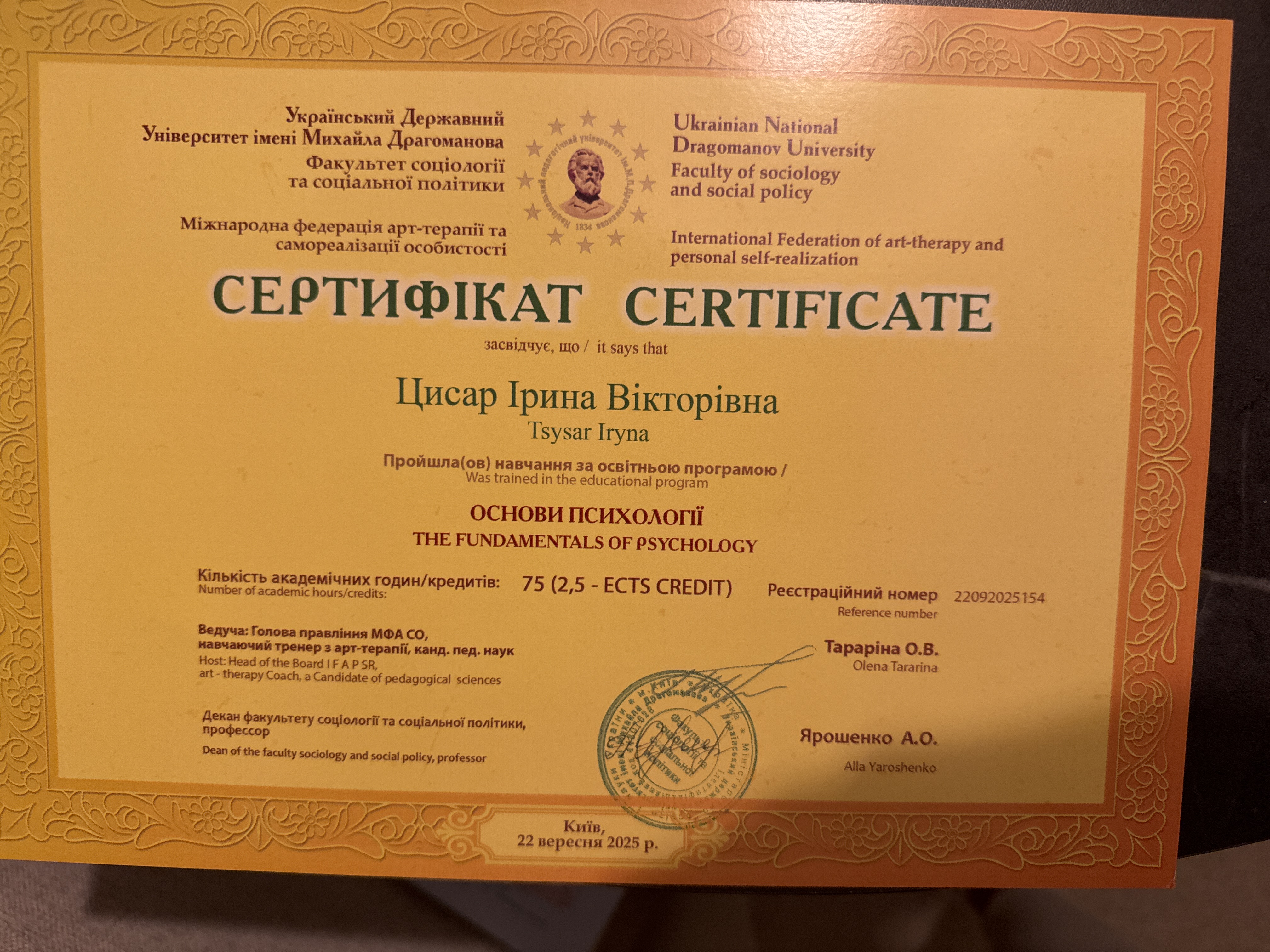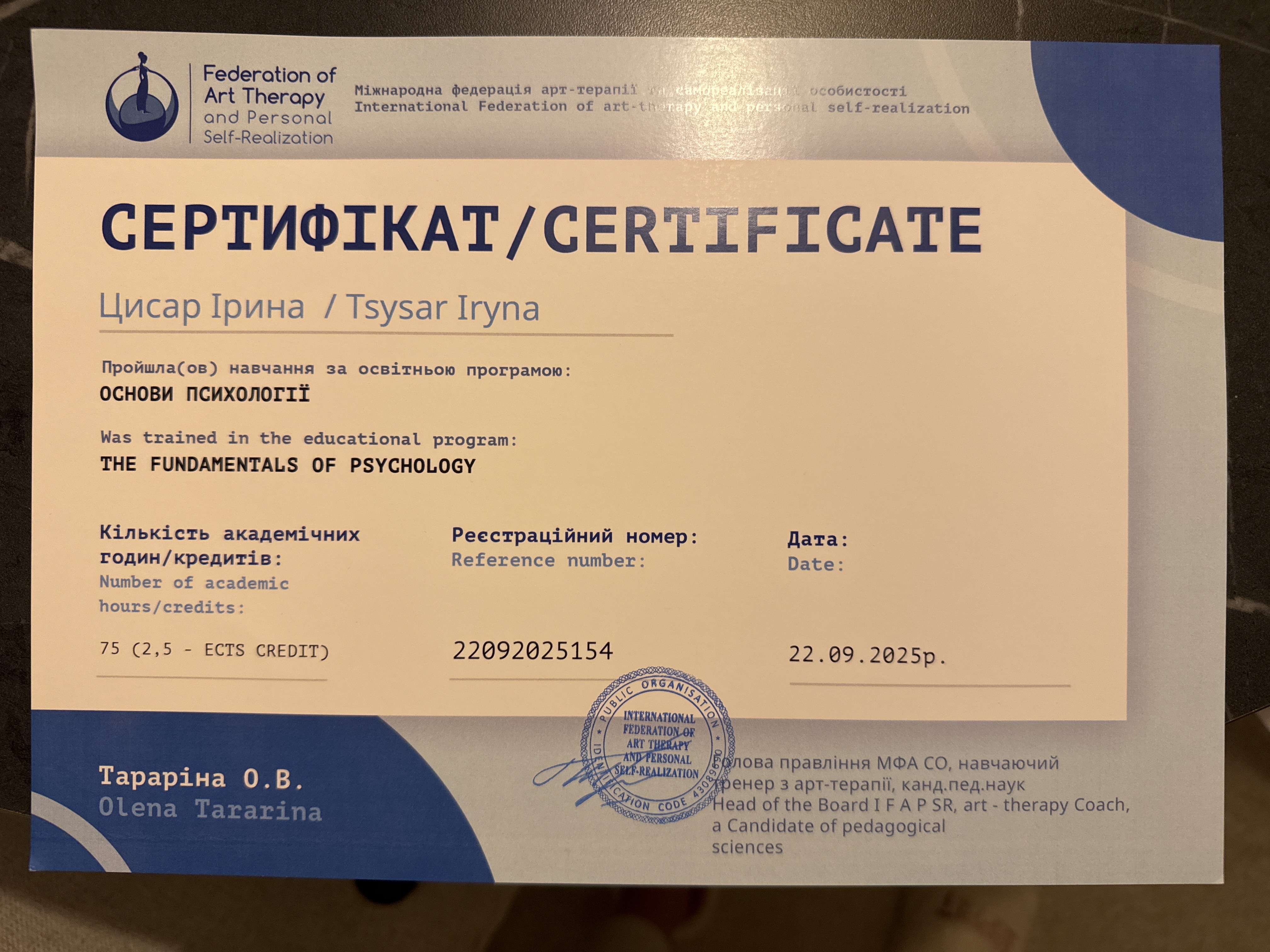 Я нахожусь на пути профессионального развития в сфере ментального здоровья и психологического благополучия. В настоящее время завершаю обучение по программе магистр обеспечения ментального здоровья и психологического благополучия в Киевском институте современной психологии (КИСП).