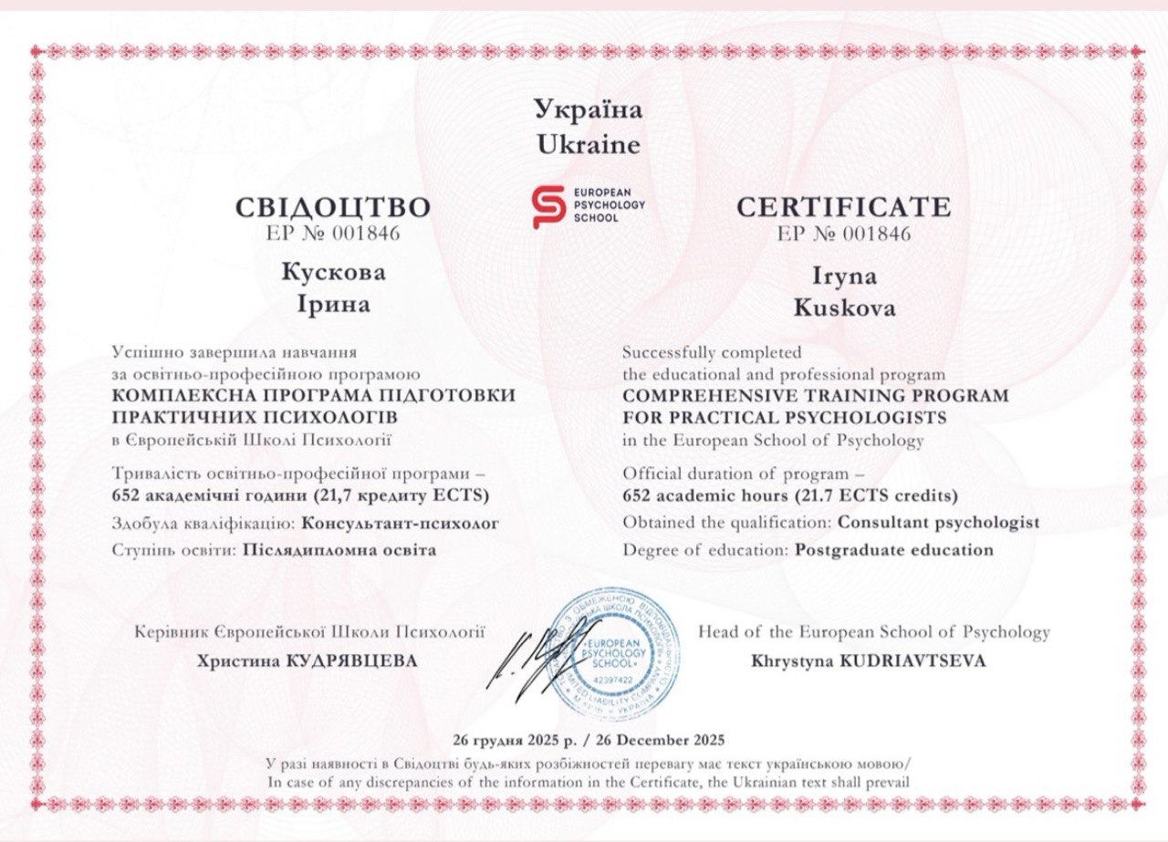 - Сертификат Психологическое консультирование с 2025 года