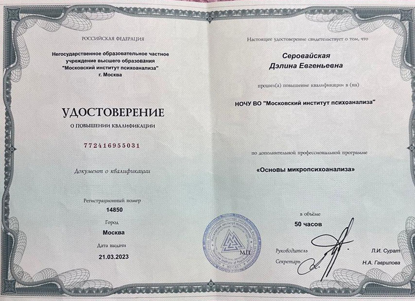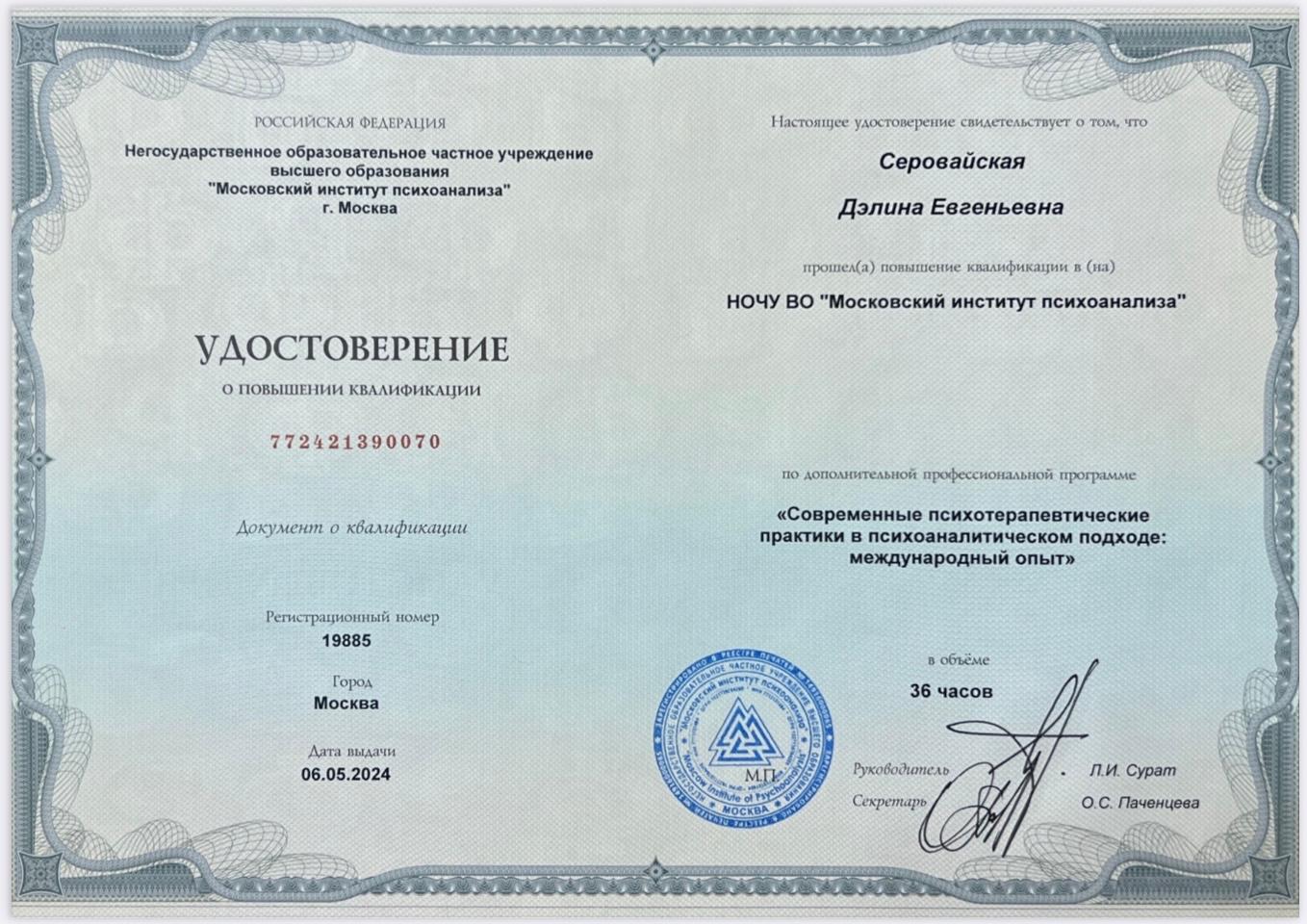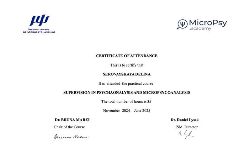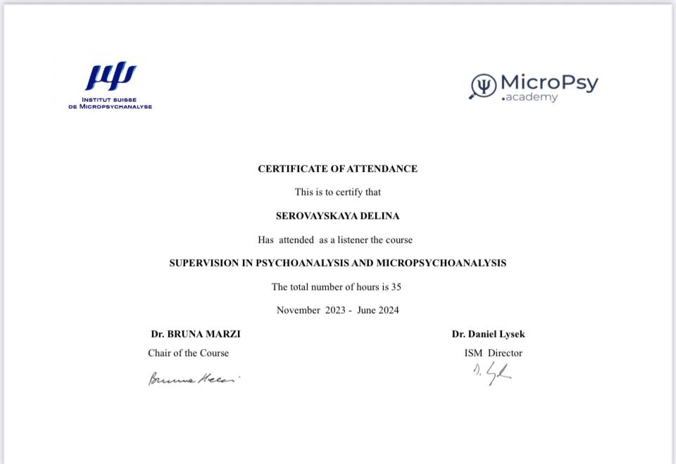 - Сертификат CERTIFICATE OF ATTENDANCE SUPERVISION IN PSYCHOANALYSIS AND MICROPSYCHOANALYSIS с 2024 года