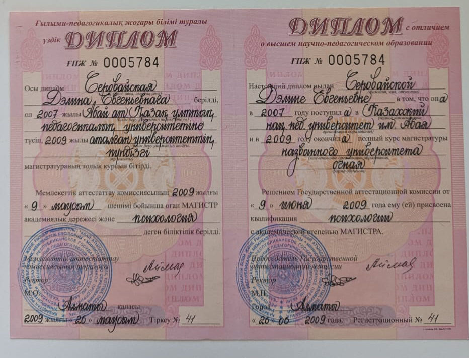 - Сертификат Диплом Магистра Психологии с 2009 года