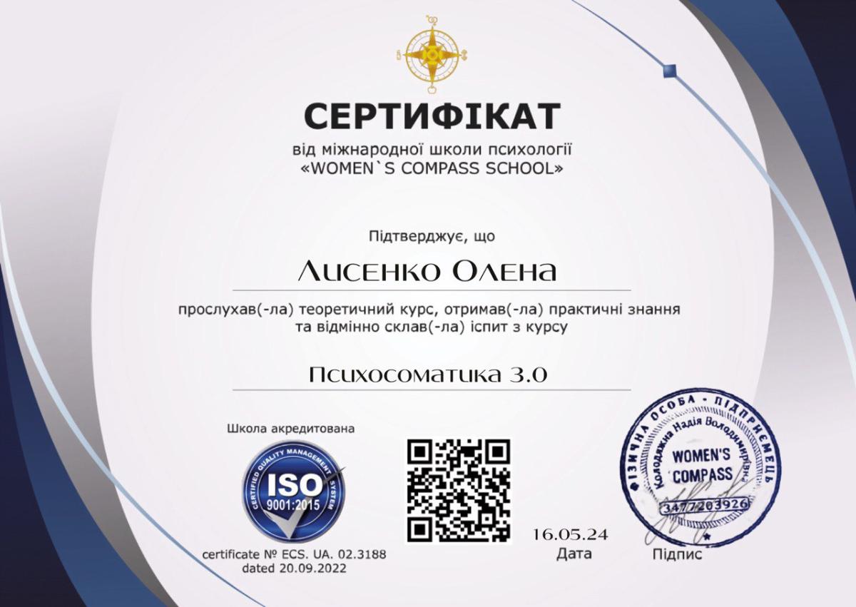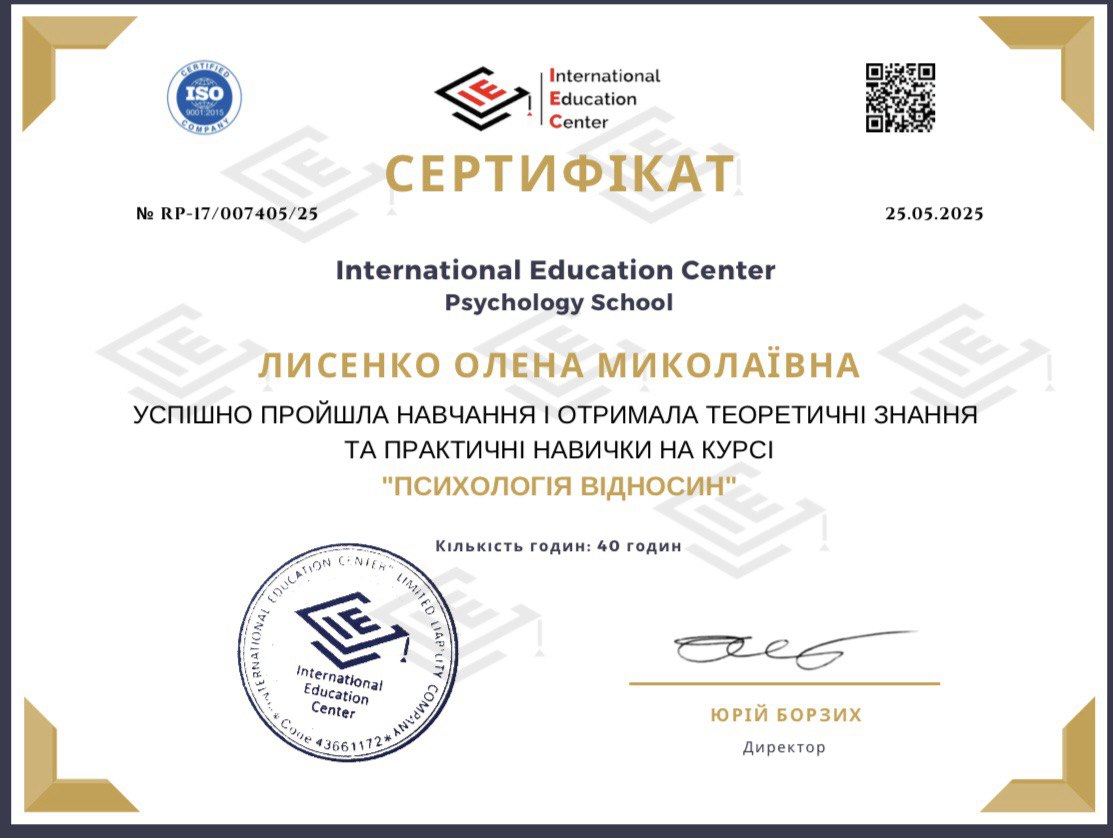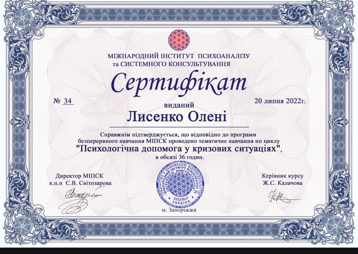 - Сертифікат Психологічна допомога у кризових ситуаціях з 2022 року