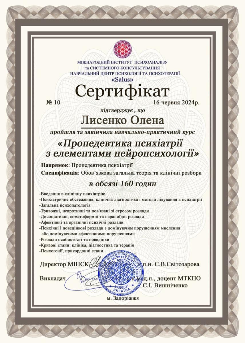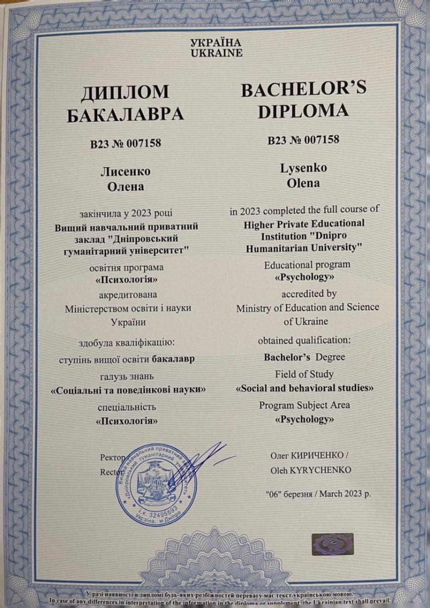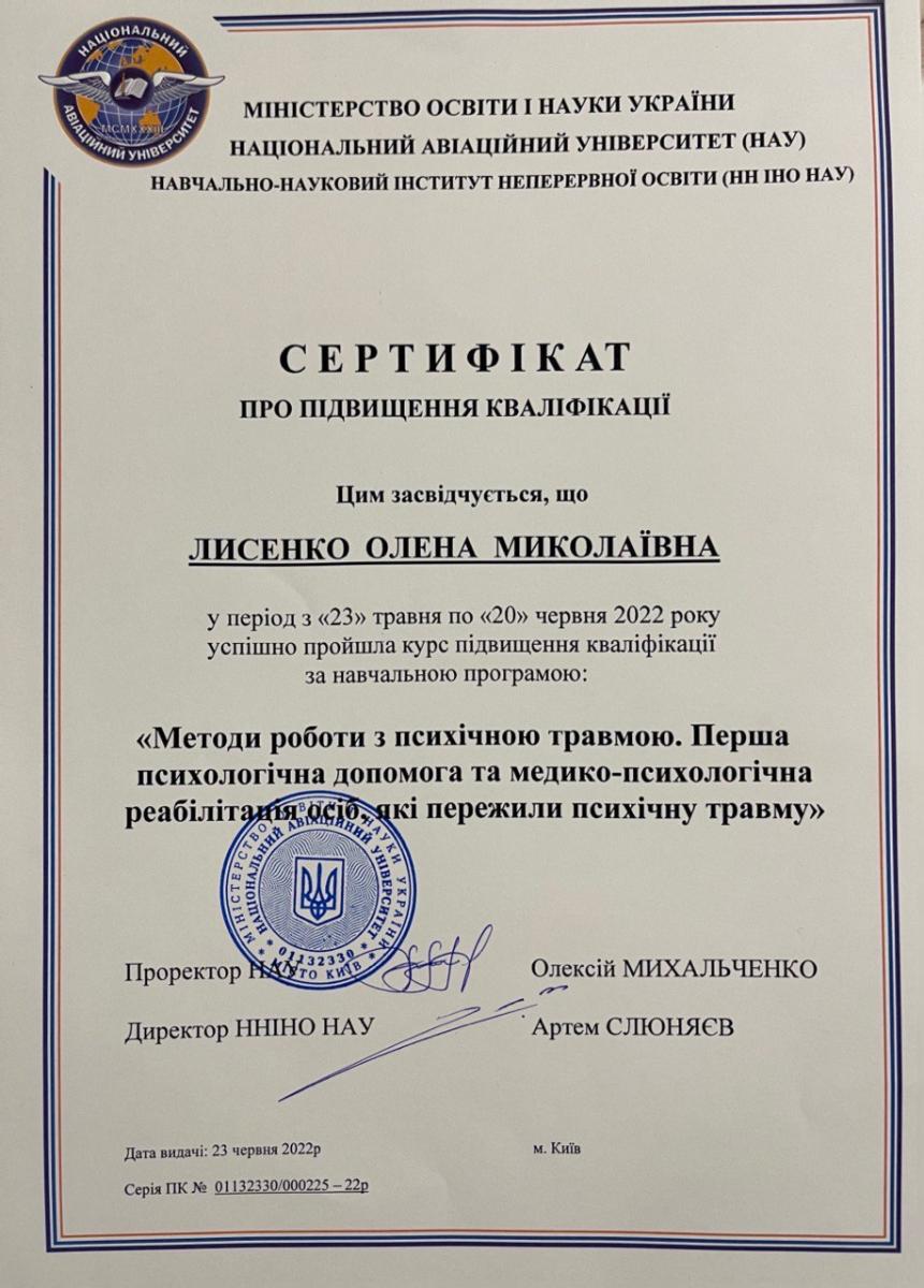 - Сертифікат Методи роботи з психічною травмою. Перша психологічна допомога та медико-психологічна реабілітація осіб, які пережили психічну травму. з 2022 року