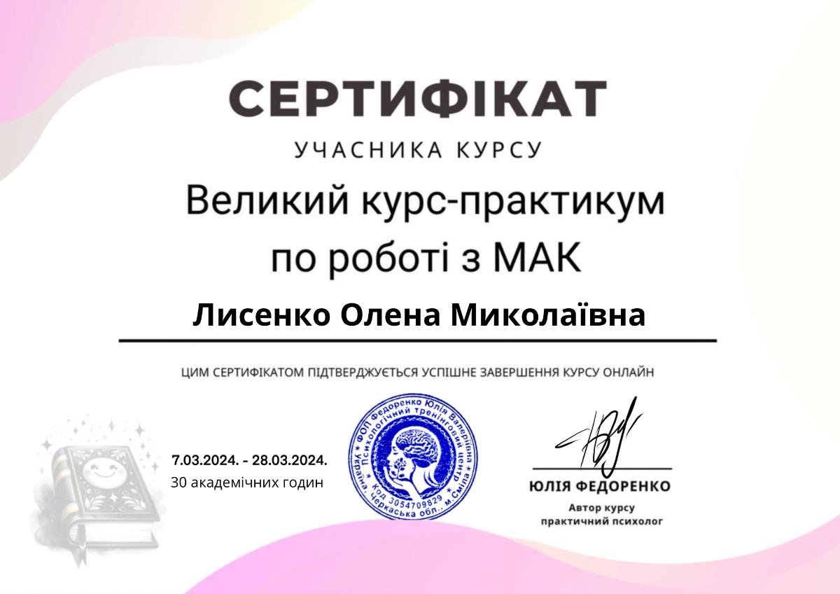 - Сертифікат Проективні методики у консулльтуванні з 2022 року