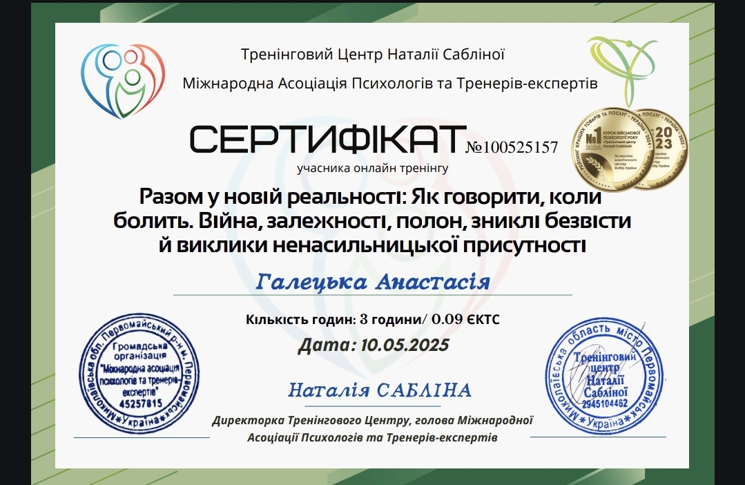 - Сертифікат Український психологічний центр Військова психологія з 2023 року